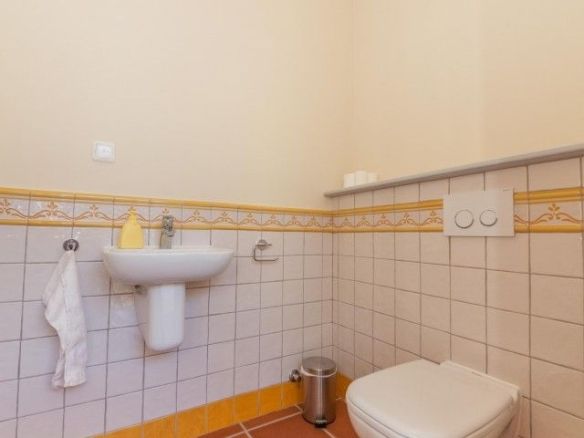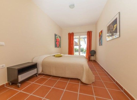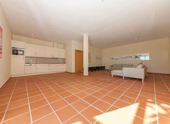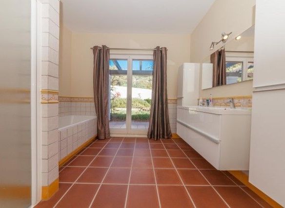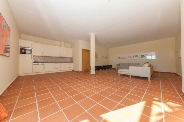 The independent guest apartment has its own entrance and also connects to the garage. Inside, there is a hallway leading to an open-plan living and dining room with fitted kitchen and access to the garden and pool. The apartment has two double bedrooms, both with fitted wardrobes and doors to the garden, sharing a bathroom and separate WC. There is also a large gym or family room and two storage rooms.