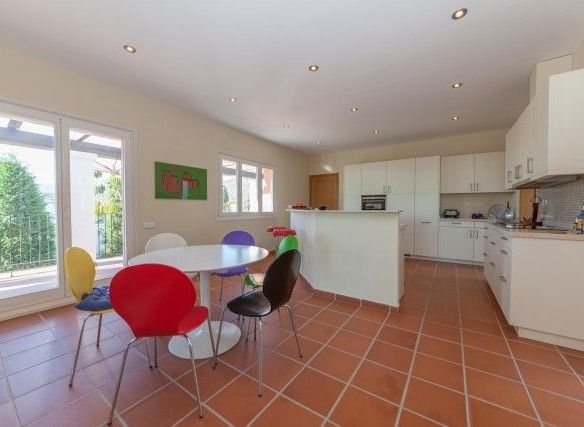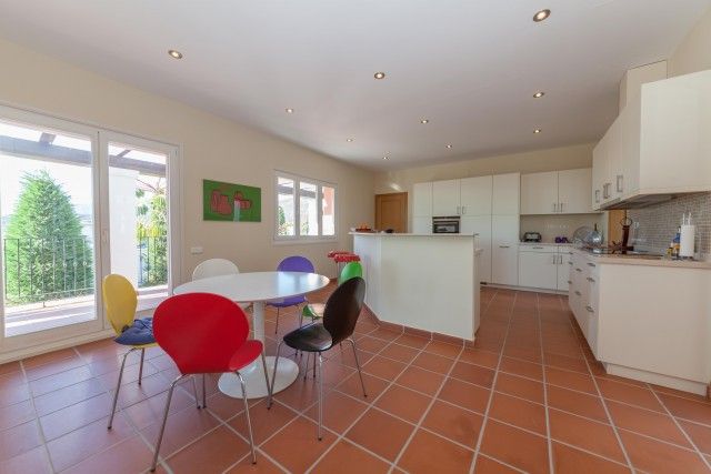 The main accommodation is set on one level and enjoys panoramic views towards the Marbella coastline, with Gibraltar, North Africa, and the Atlas Mountains visible on clear days. A traditional courtyard entrance leads into a hallway and on to a large open-plan living space with vaulted ceiling, sitting and dining areas, and French doors opening onto a wraparound terrace with shaded and open-air seating and dining areas. The kitchen is also spacious, with a central island, Silestone worktops, integrated appliances, and additional dining space.
