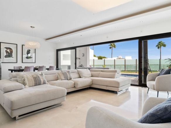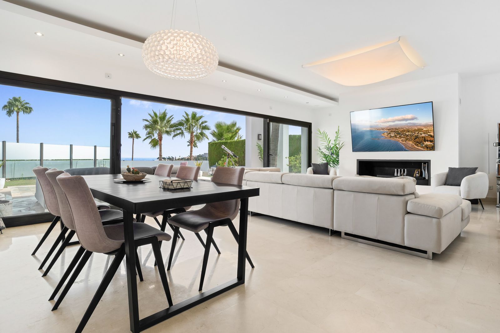 The interior comes fully furnished, showcasing a sleek, fully fitted kitchen, a bright dining room, and an inviting living area. Floor-to-ceiling glass doors flood the home with natural light while framing panoramic vistas of the sea, mountains, golf course, and surrounding greenery. Enjoy unobstructed views stretching across the coastline — a spectacular setting for entertaining or sunset cocktails.