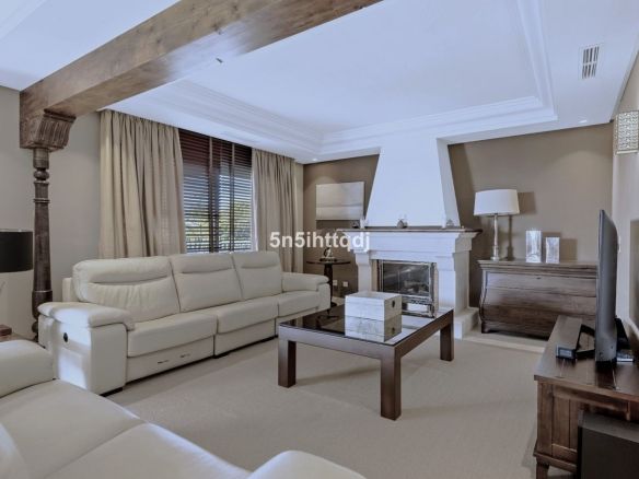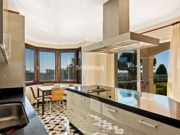 This classic-style, five-bedroom villa features a spacious entrance hall leading to an open-plan kitchen with a central island. The kitchen opens directly to the garden, extending the living space outdoors. Adjacent to the kitchen is the dining room and the main lounge, which includes a working fireplace. The ground floor also includes a guest bedroom suite and a convenient cloakroom.