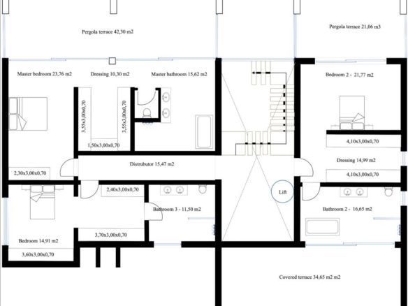 First floor: Master bedroom with en-suite bathroom with 2 dressing rooms and 2 private terraces On this floor, we have also another 2 bedrooms with ensuite bathrooms and dressing. One of the bedrooms has access to the terrace.