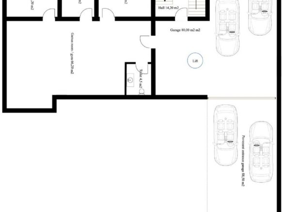 Basement; hall, garage, toilet, sauna, games room, storage room and technical pool room.