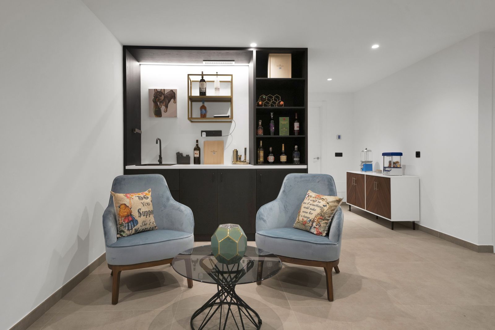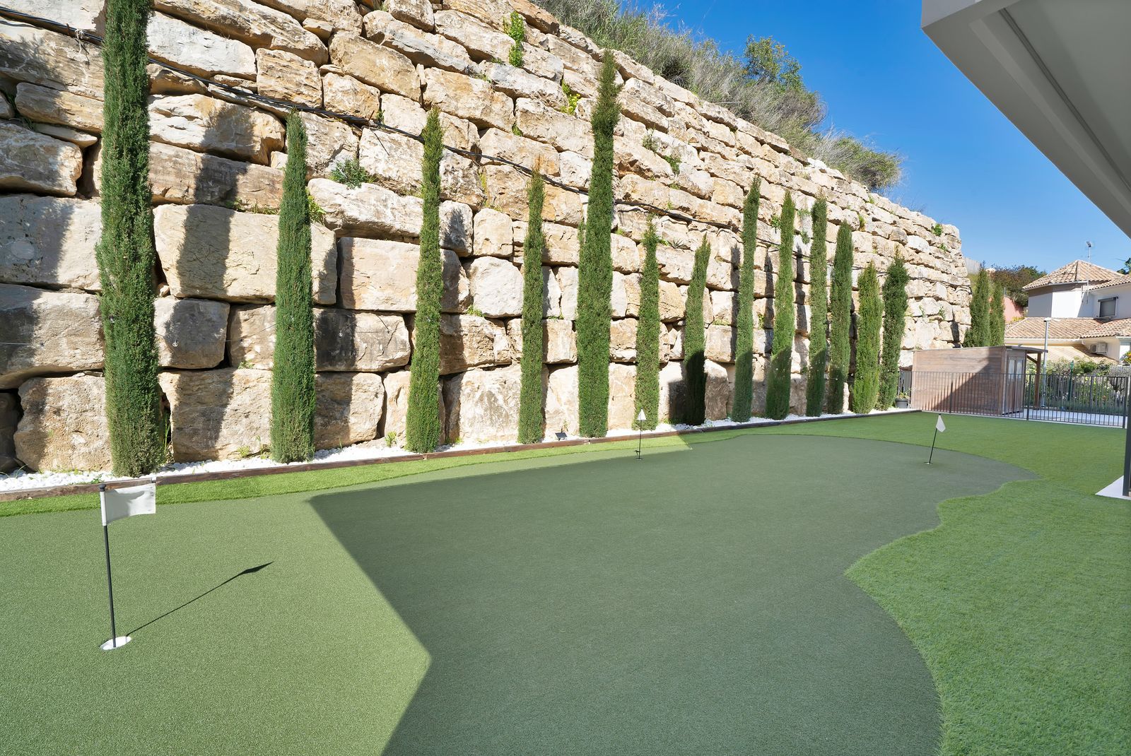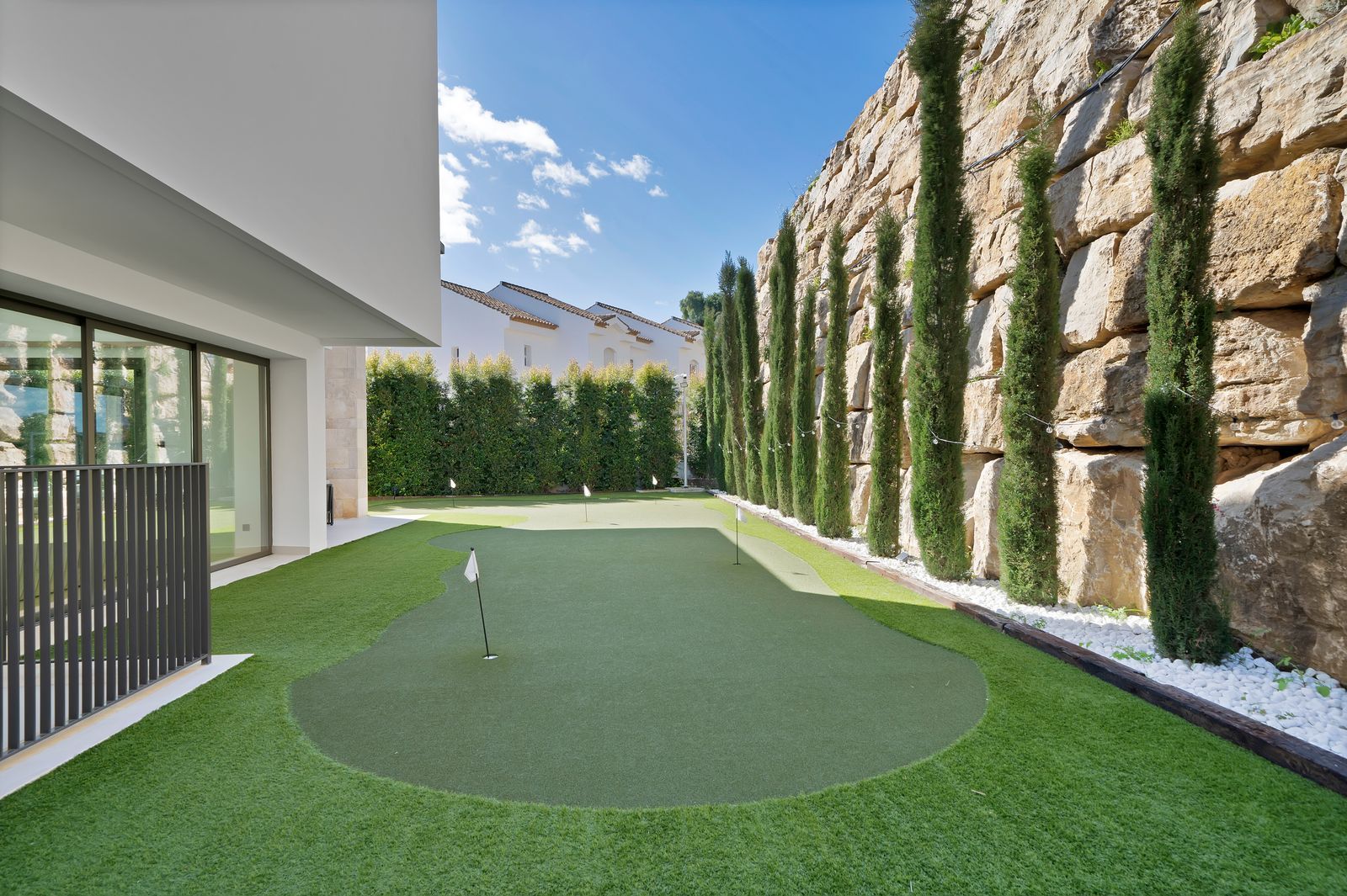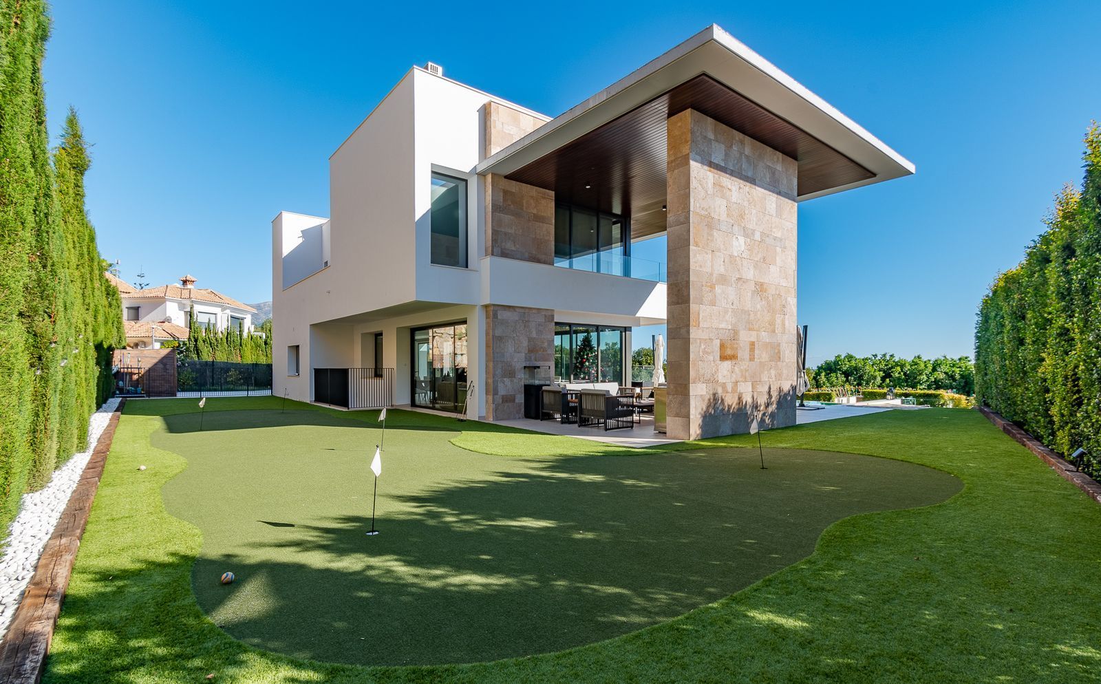 Designed for golf enthusiasts, the villa features putting greens in the garden and a professional golf simulator, offering a premium experience without leaving home.