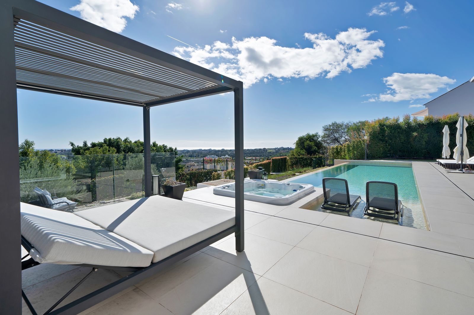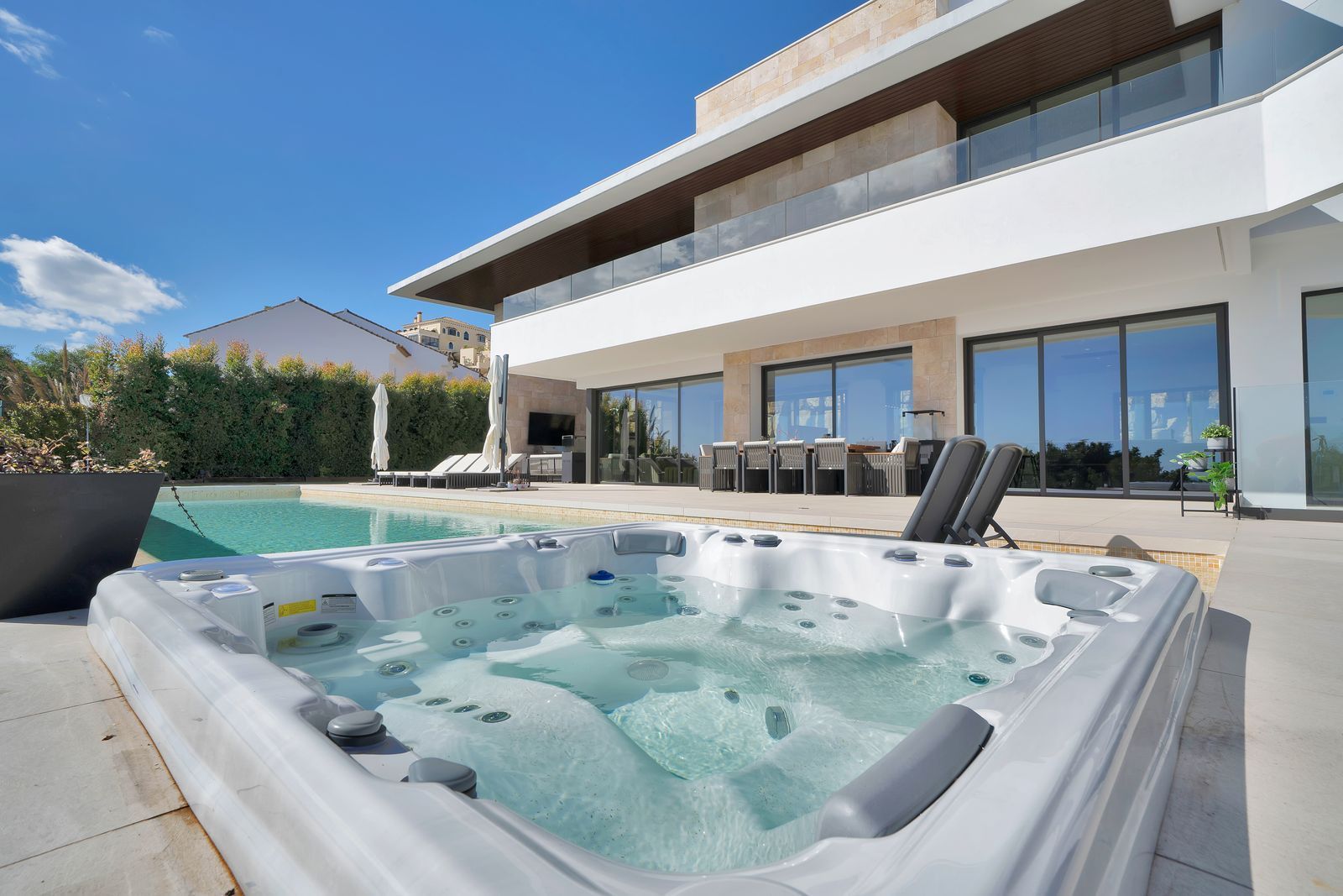 Outdoors, relaxation is guaranteed with a heated jacuzzi and a stunning heated private pool, surrounded by beautifully landscaped gardens. The property also boasts a covered chill-out area with a TV, perfect for enjoying the outdoors in total comfort.