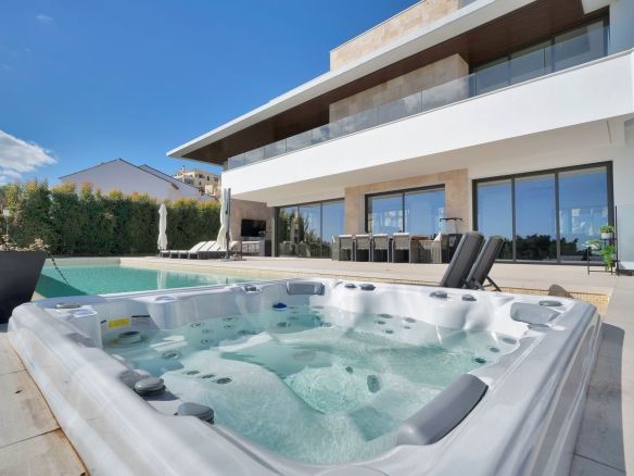 Outdoors, relaxation is guaranteed with a heated jacuzzi and a stunning heated private pool, surrounded by beautifully landscaped gardens. The property also boasts a covered chill-out area with a TV, perfect for enjoying the outdoors in total comfort.