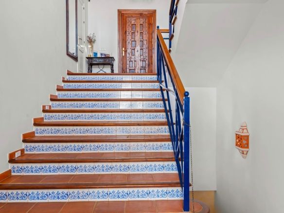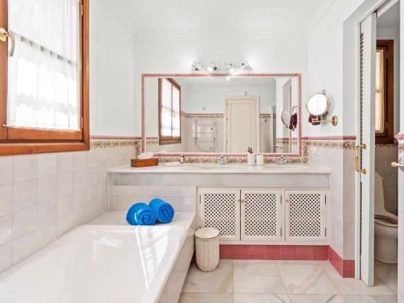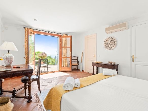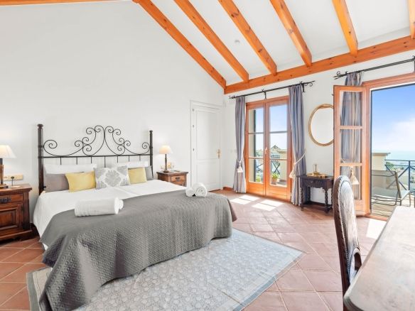 As you enter the property, you are greeted by an impressive a double-height ceiling. On the ground floor you’ll find a beautiful hall which flows into the spacious living room on the right, also with its own fireplace and dining area. Going back to the hall and straight ahead you’ll enter to the fully equipped kitchen with a dining area for casual meals and pantry. Additionally, with two bedroom and two bathroom. From this level you can enter to the expansive terrace that provides ample space for relaxation and entertainment, with views extending across the lush gardens and out towards the sea.