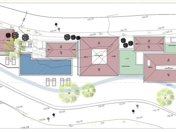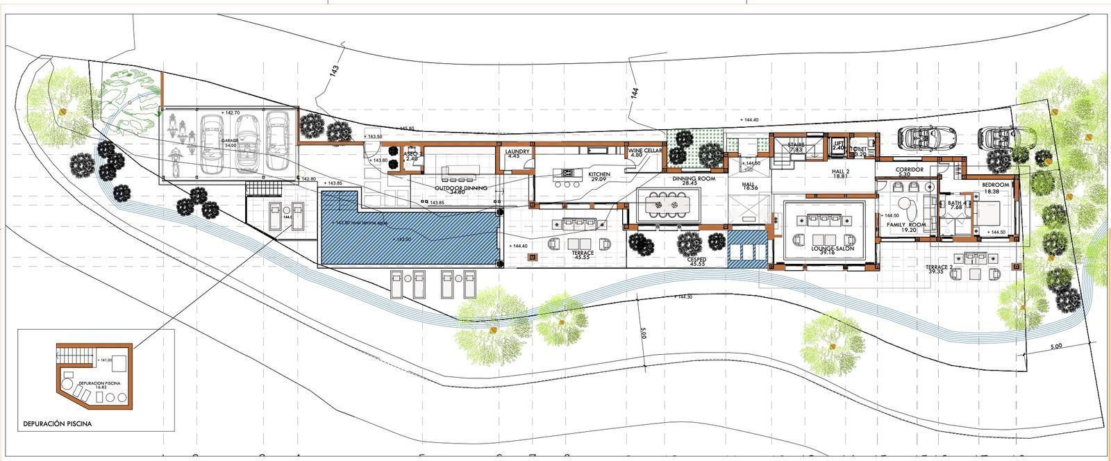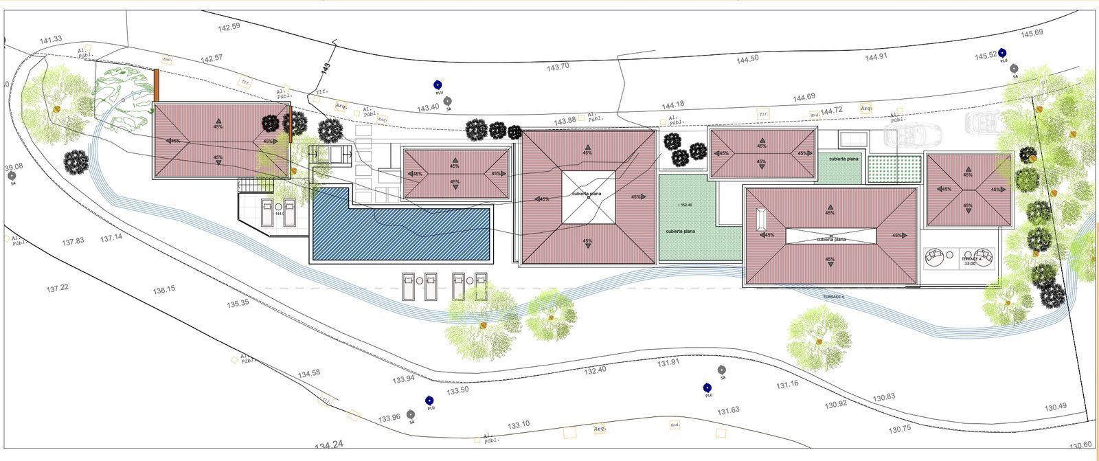 This villa will be nestled on a plot surrounded by forest, with an elongated, south-facing shape, allowing for the most spectacular views and sunlight. The house will have a total of 733 m2 of usable area, of which 387 m2 will be interior, 124 m2 will be covered terraces, 100 m2 will be open terraces, and the remainder will comprise the 66 m2 pool plus parking.