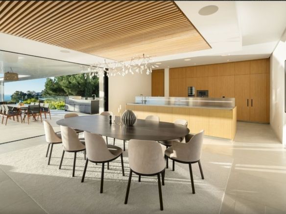 The residence boasts eight generously sized en-suite bedrooms and two additional guest bathrooms, ensuring comfort and privacy for both residents and visitors. The heart of the home is a spacious open-plan living and dining area, complemented by a state-of-the-art Gaggenau kitchen featuring the latest high-end appliances. Expansive floor-to-ceiling windows flood the interiors with natural light and frame stunning sea views. A sleek, modern fireplace enhances the ambiance, creating a warm and inviting space year-round.