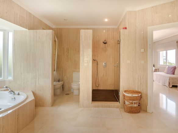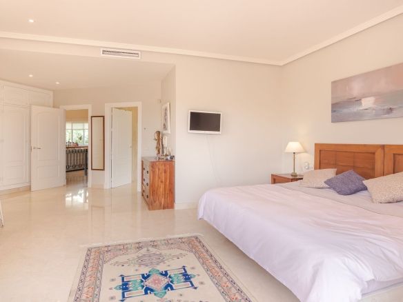 When you come up the stairs from the living room, you first enter a large mezzanine that is between the two bedroom wings. On the mezzanine there is a nice area to relax, sit and read or work. On this level there are two bedroom wings. The huge master suite has the whole of one wing. The bedroom is large and airy and the patio door leads out to a large terrace with sea views. There is plenty of wardrobe space and the bathroom is large with a separate shower and jacuzzi. The second bedroom wing consists of two spacious bedrooms, both with en suite bathrooms. There are also extra wardrobes, and one bedroom also has access to a nice terrace.