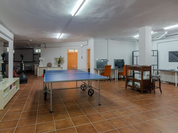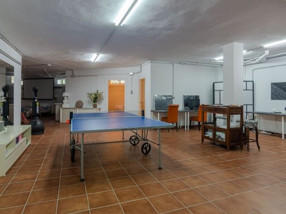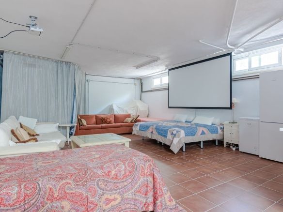 From the living room the stairs go down to the lower floor. Here you will find an additional bedroom and bathroom with toilet, great if you have staff or if you have extra guests. In the garage part there is room for many cars. Current owners have built a gaming area for the kids with game stations and a table tennis table. There is also an area used as a cinema and relaxation area. There is another very large room that is not in the pictures. This is used today as a storage room, but if the new owner wants another use, it can be used to make a spa there, fitness room or several bedrooms.
