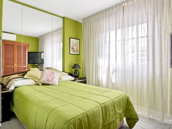 The main bedroom has long windows with plenty of light and an adjacent bathroom..