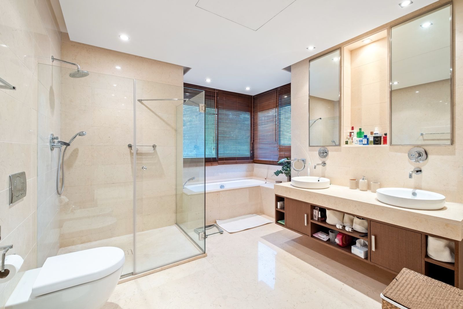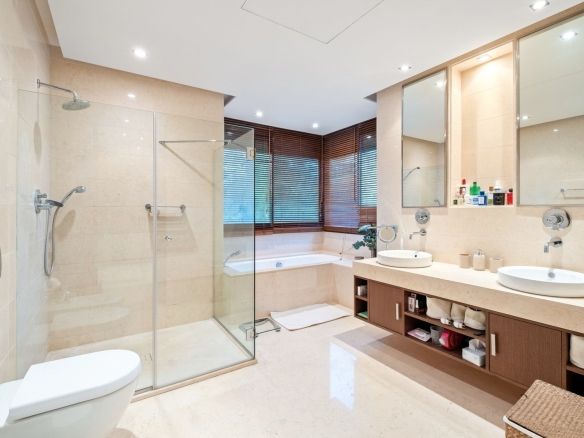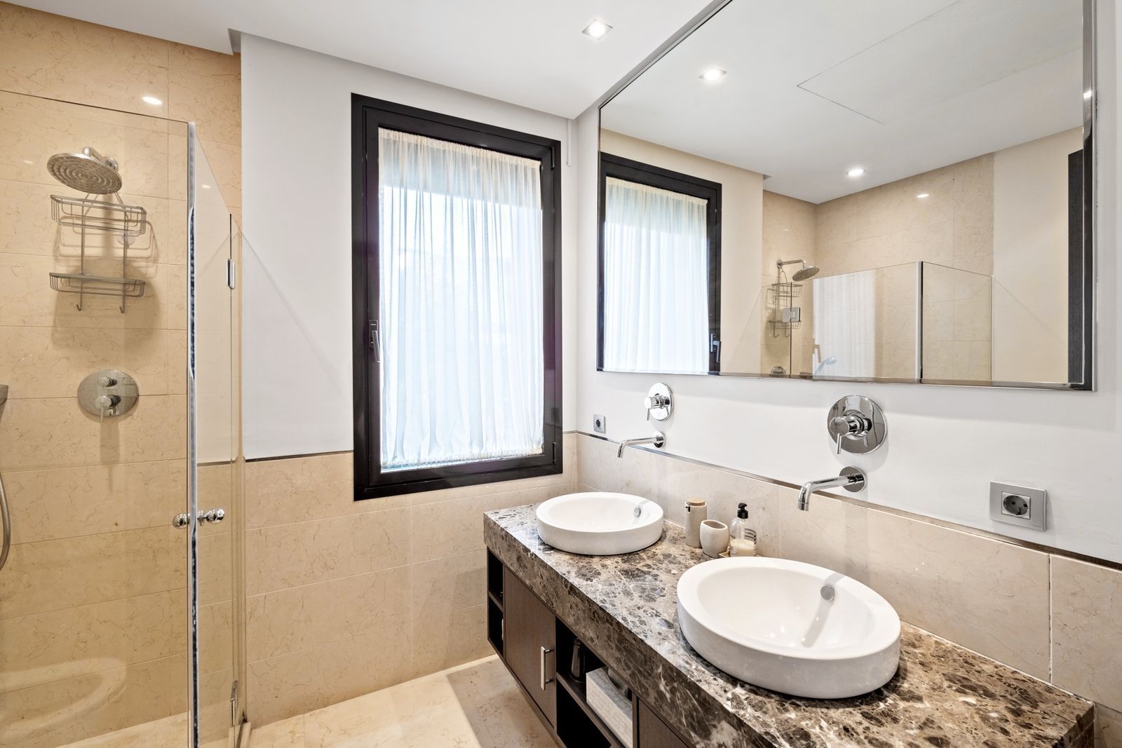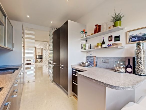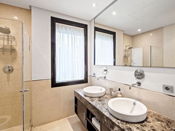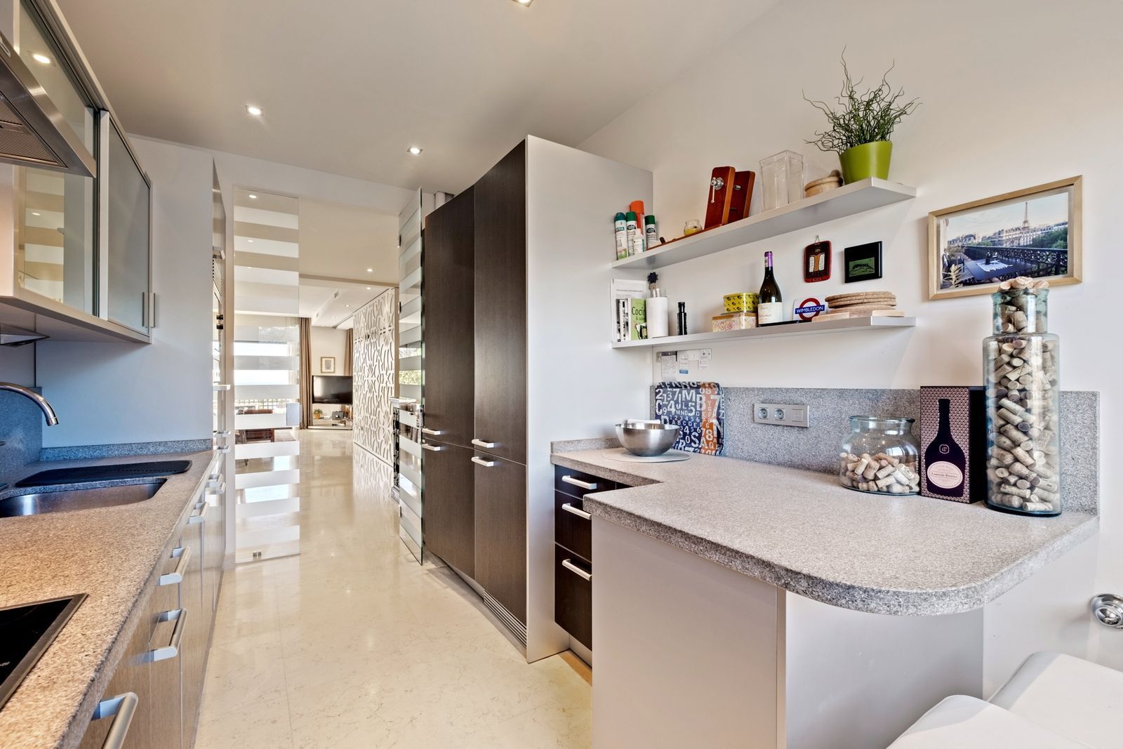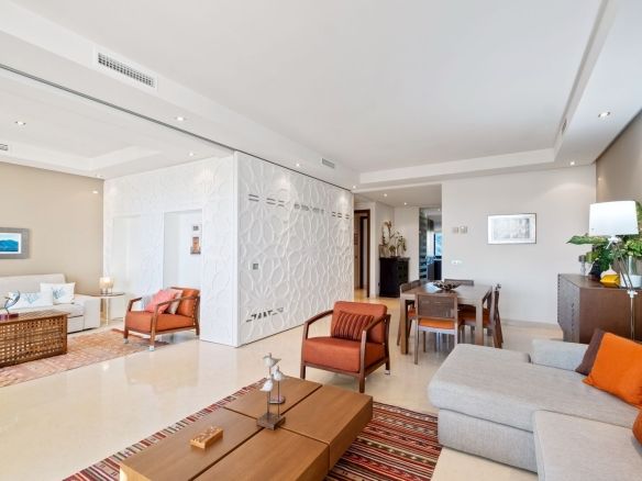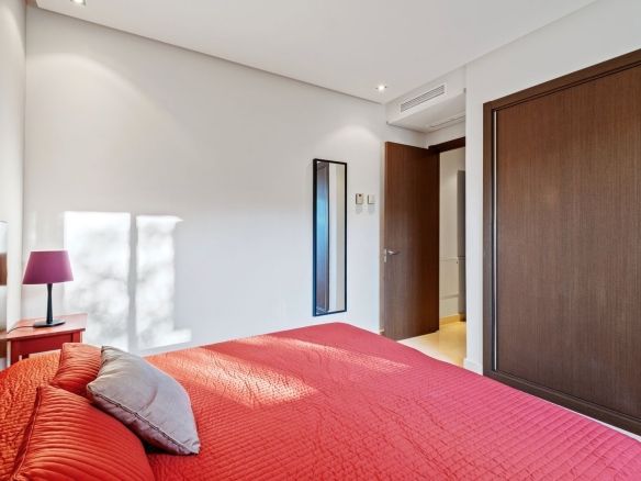 The apartment features 2 bedrooms and 2 bathrooms, with very spacious rooms, especially the master bedroom. The living room can be converted into a third bedroom: when open, the door is fully integrated and invisible, when closed it becomes a stylish featured wall.