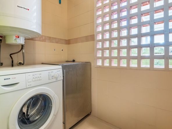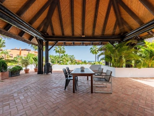 The property boasts a generous 42 m² terrace, partly covered for year-round use, and a private garden of around 50 m², creating an inviting space for outdoor dining, sunbathing, or simply relaxing while taking in the stunning views. Facing southwest, the terrace and garden enjoy long afternoon sun and sweeping vistas over the coast, stretching all the way to Gibraltar and the mountains of Africa.