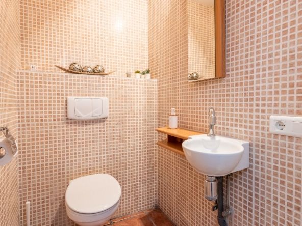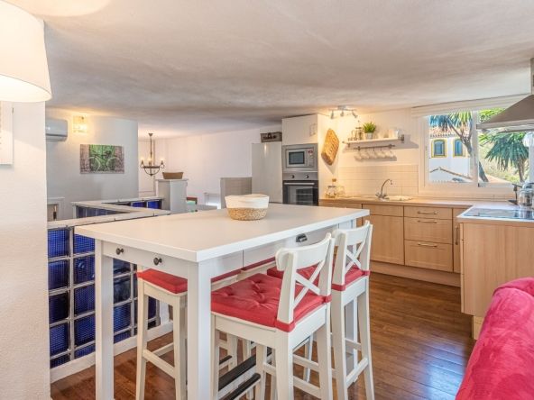 This home has been nicely renovated, with a modern open plan kitchen, dining room and living room with beautiful views to the communal pool, consisting of 2 double bedrooms with 1 bathroom on the lower floor and a guest toilet. This home enjoys access to the pool just a few steps away.