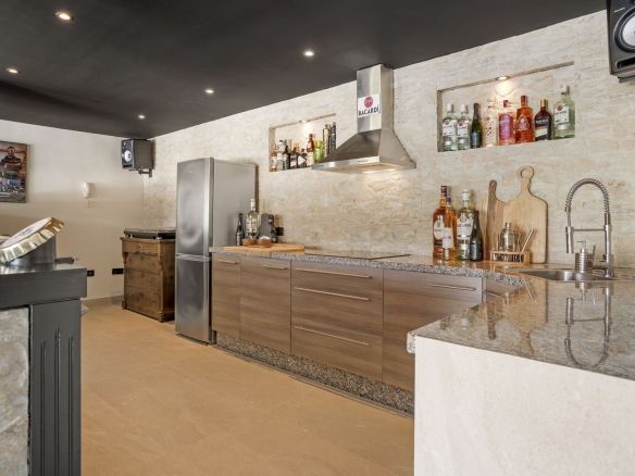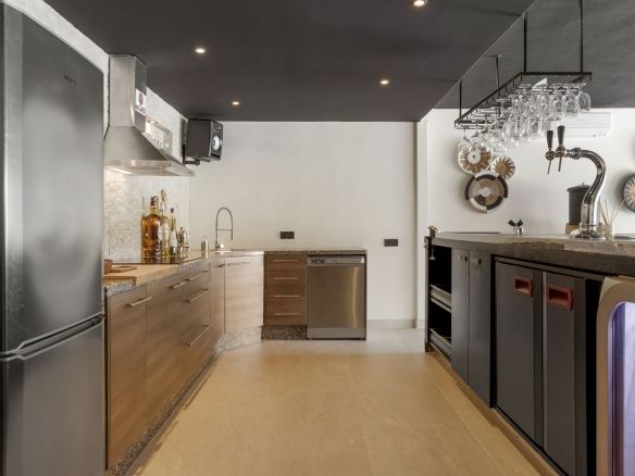 The modern designer kitchen, complete with a built-in wine fridge, provides direct access to the terrace ideal for indoor-outdoor living.