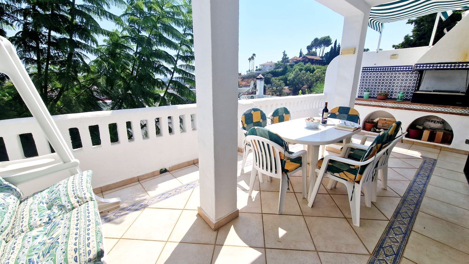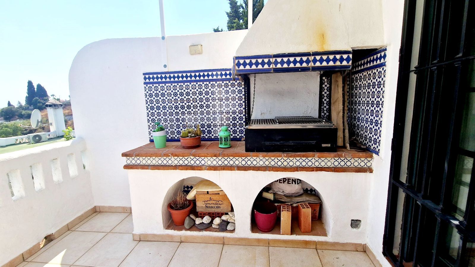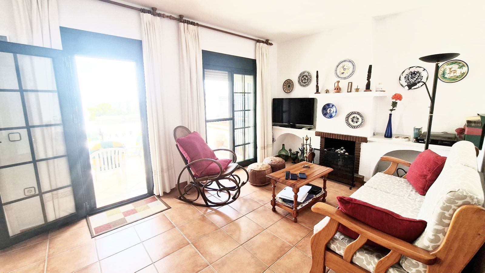 Partially renovated townhouse in Campo Mijas with panoramic views. Spread over 3 floors, it features 3 bedrooms, terraces on every level, a solarium, modern kitchen, and BBQ terrace. Community pool & gardens included. Peaceful location just 5 minutes from town!