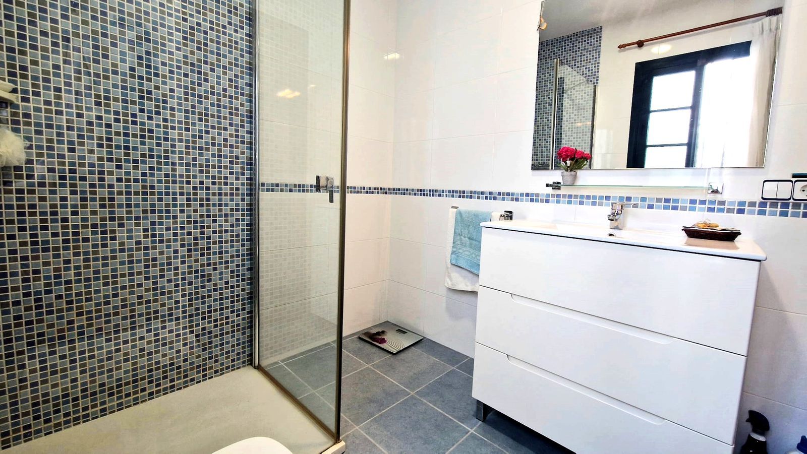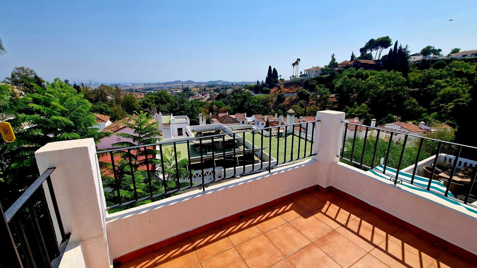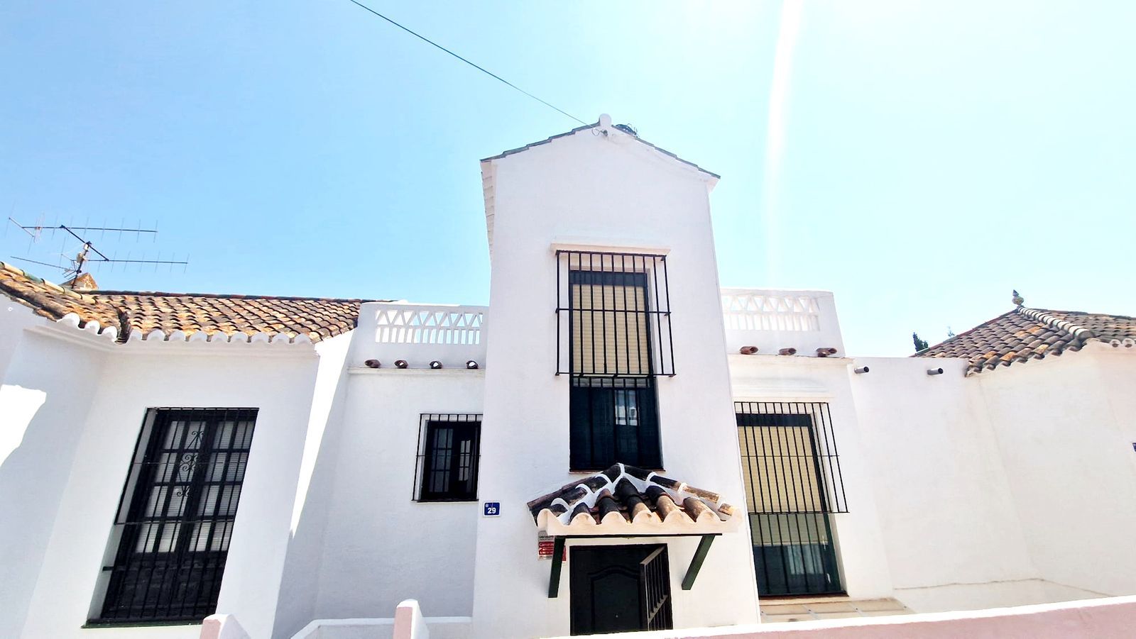 Partially renovated townhouse in Campo Mijas with panoramic views. Spread over 3 floors, it features 3 bedrooms, terraces on every level, a solarium, modern kitchen, and BBQ terrace. Community pool & gardens included. Peaceful location just 5 minutes from town!