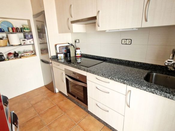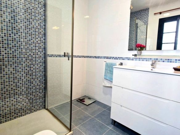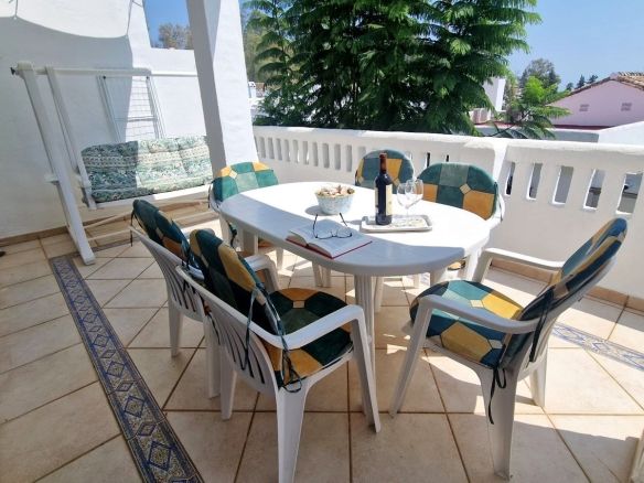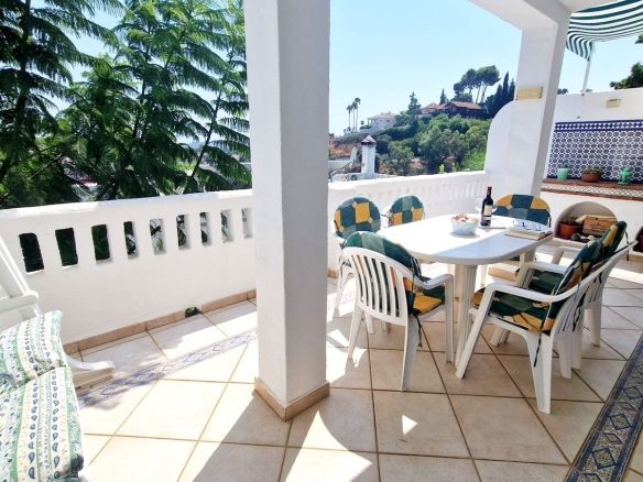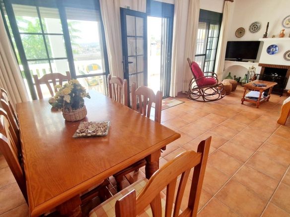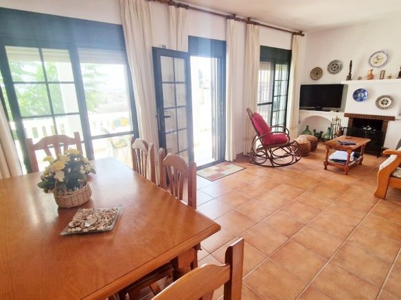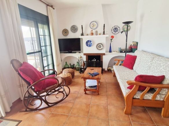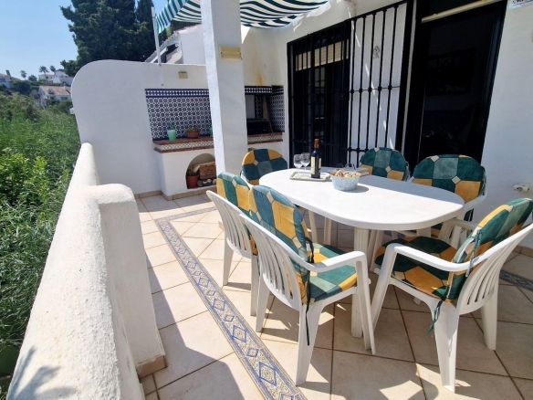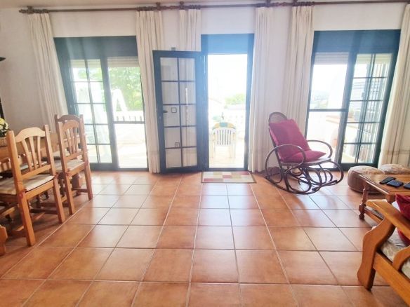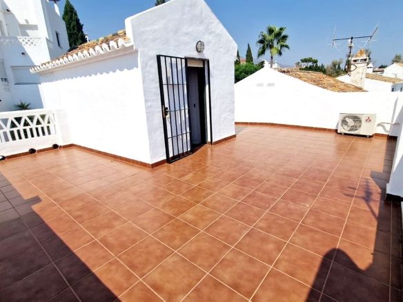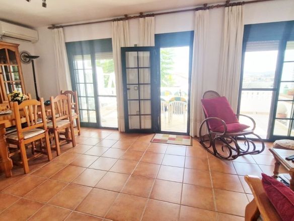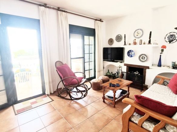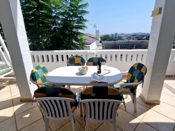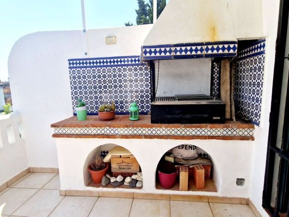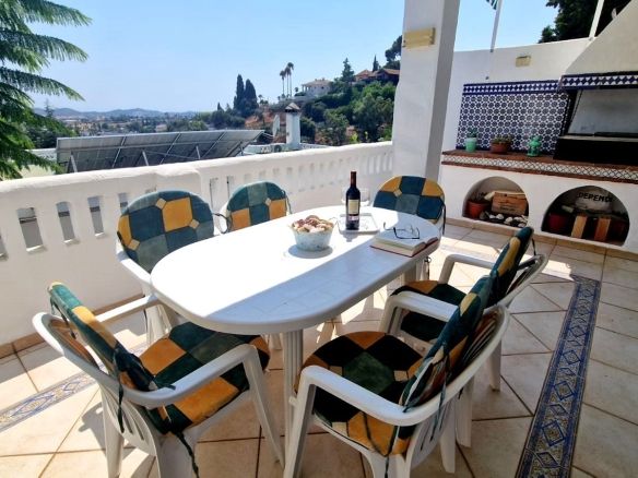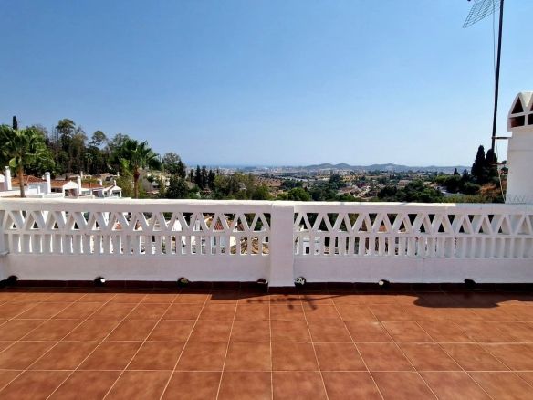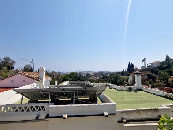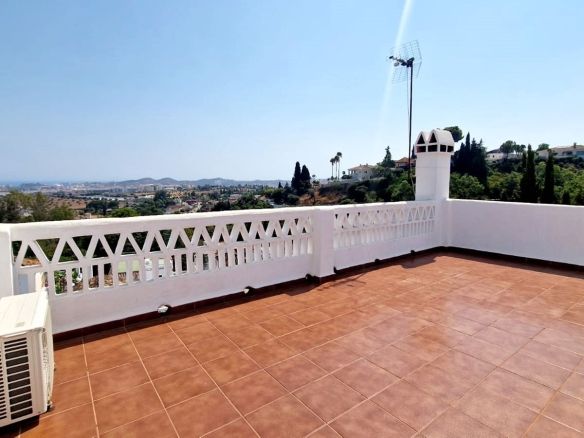 Partially renovated townhouse in Campo Mijas with panoramic views. Spread over 3 floors, it features 3 bedrooms, terraces on every level, a solarium, modern kitchen, and BBQ terrace. Community pool & gardens included. Peaceful location just 5 minutes from town!