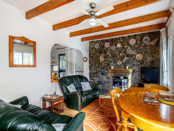The property features a well-proportioned, 59m² interior, including a good-sized kitchen and a warm lounge complete with a decorative stone feature wall and integrated wood stove fireplace—ideal for relaxing evenings. There are two, equally sized bedrooms and a family bathroom. The main bedroom also enjoys direct access to the conservatory, a lovely spot to unwind while overlooking the private pool, which adds to the finca's appeal.