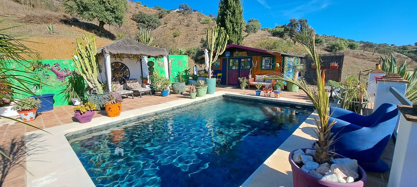 When we enter the garden, we are struck by the wonderful combination of attractive terraces, planters, lounge areas, and the beautiful swimming pool! A great place to enjoy the Spanish outdoor life. The whole area has been laid out with great taste, and we would particularly like to mention the beautiful tiling of the swimming pool. The views from the garden and the swimming pool are spectacular and will never bore you.