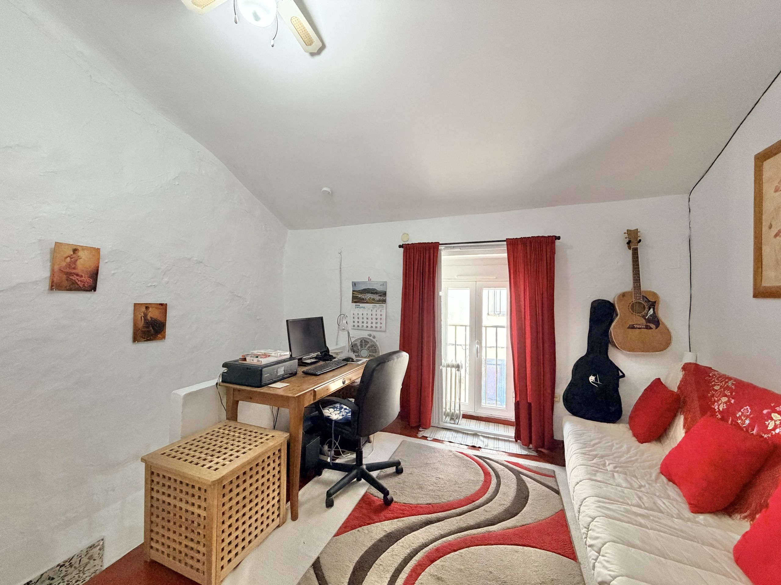 Going back into the property and returning to the entrance hall and up the stairs you find a second living space currently used as an office area, with ceiling fan. From here there is access to another large double bedroom, also fitted with air conditioning, and also the main master bedroom with impressive roof height and also the added benefit of an ensuite.