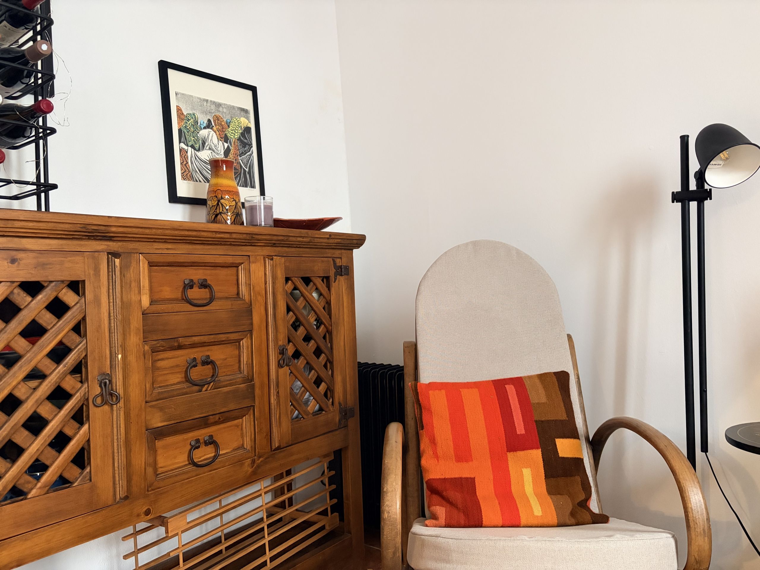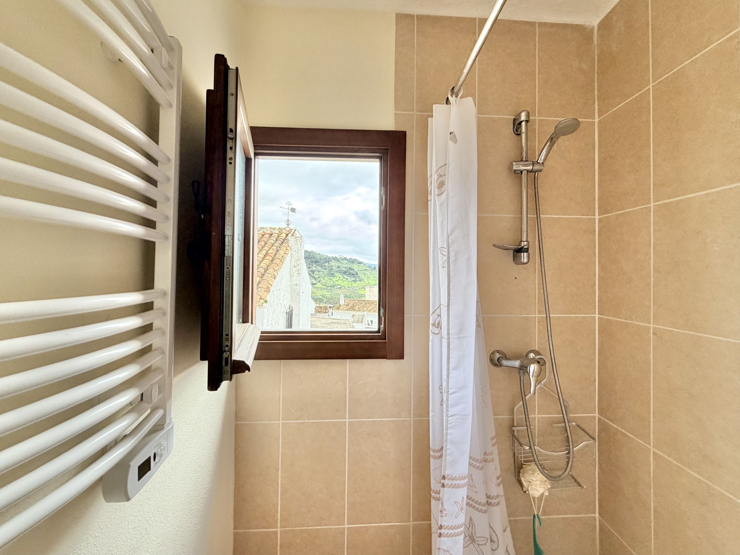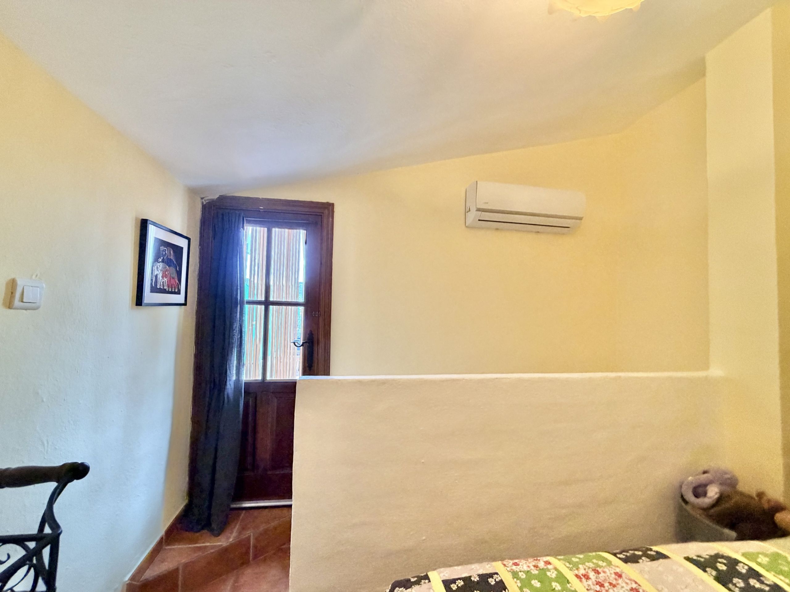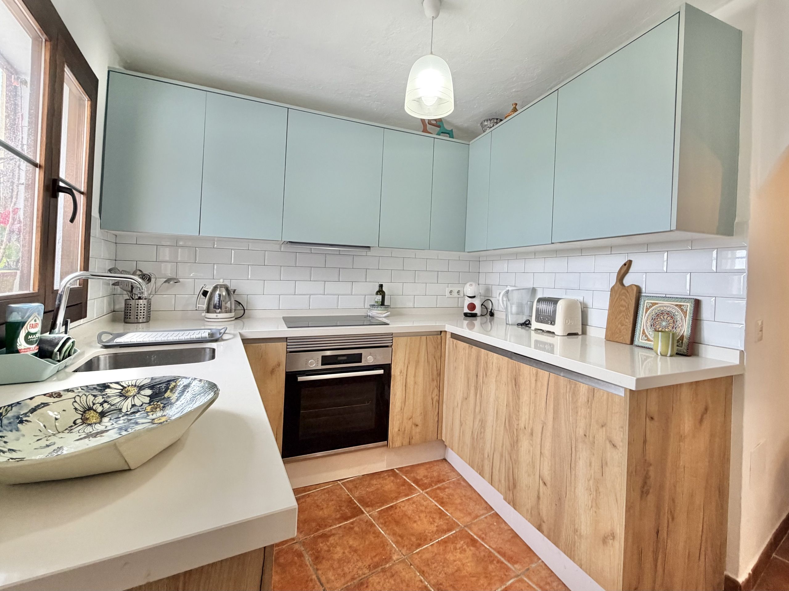 Entering through the quiet alleyway and passing through the high-quality solid wooden double doors, you are welcomed into an open-plan living room with air conditioning, featuring a pellet stove and leading into a fully modernised kitchen with views over the village. The kitchen offers good storage space and is well proportioned.