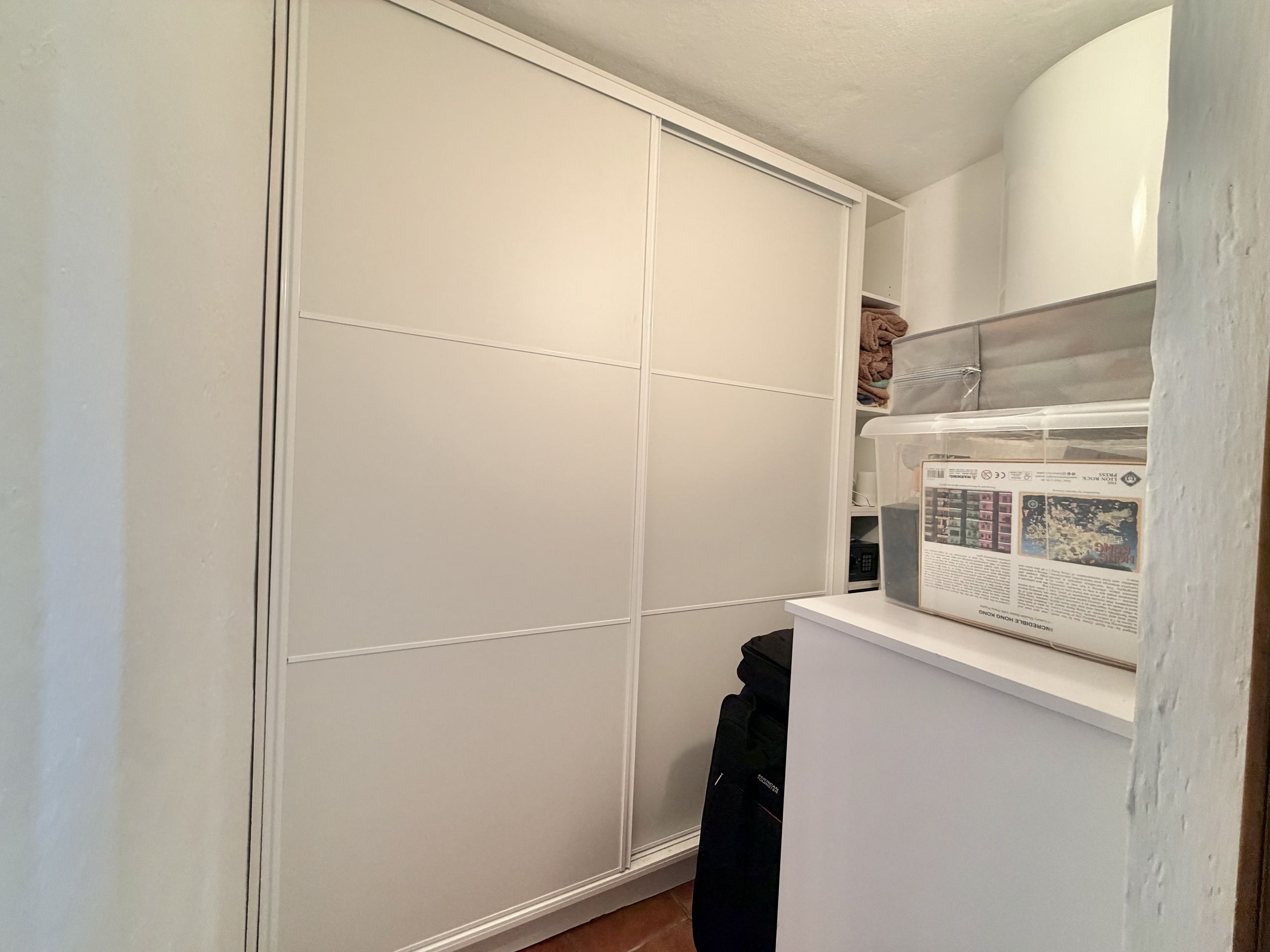 Going upstairs to the first floor, there is a well-proportioned double bedroom to the left overlooking the alleyway. To the right you enter the master bedroom with en-suite bathroom. The main part of the room is spacious and features air conditioning and dual aspect windows, one overlooking the quiet side street and the other facing the village. There is also a separate dressing room where the boiler is located, a small sitting area, and a private bathroom, which also enjoys views over the village.