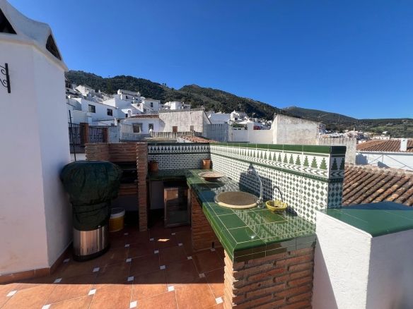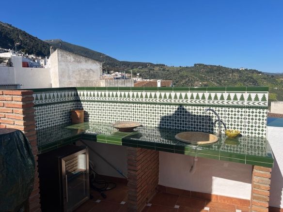 From here you access the large L-shaped terrace. This area is undoubtedly one of the highlights of Casa Verde, featuring a relaxation area, a summer kitchen with traditional Andalusian tiles, a barbecue area, and a space with a sink and fridge. Surrounding this area is a bar space offering stunning views over the village and the valley.