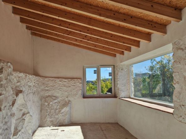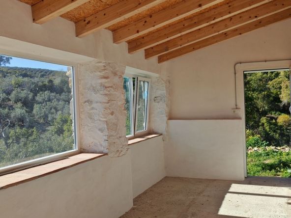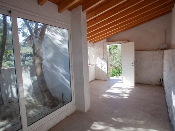 The main house has been fully renovated and features a covered veranda across the entire front. Next to the house, there is an underground water storage tank. The property is connected to municipal water and also has access to irrigation water. Surrounding the four buildings are various fruit trees.