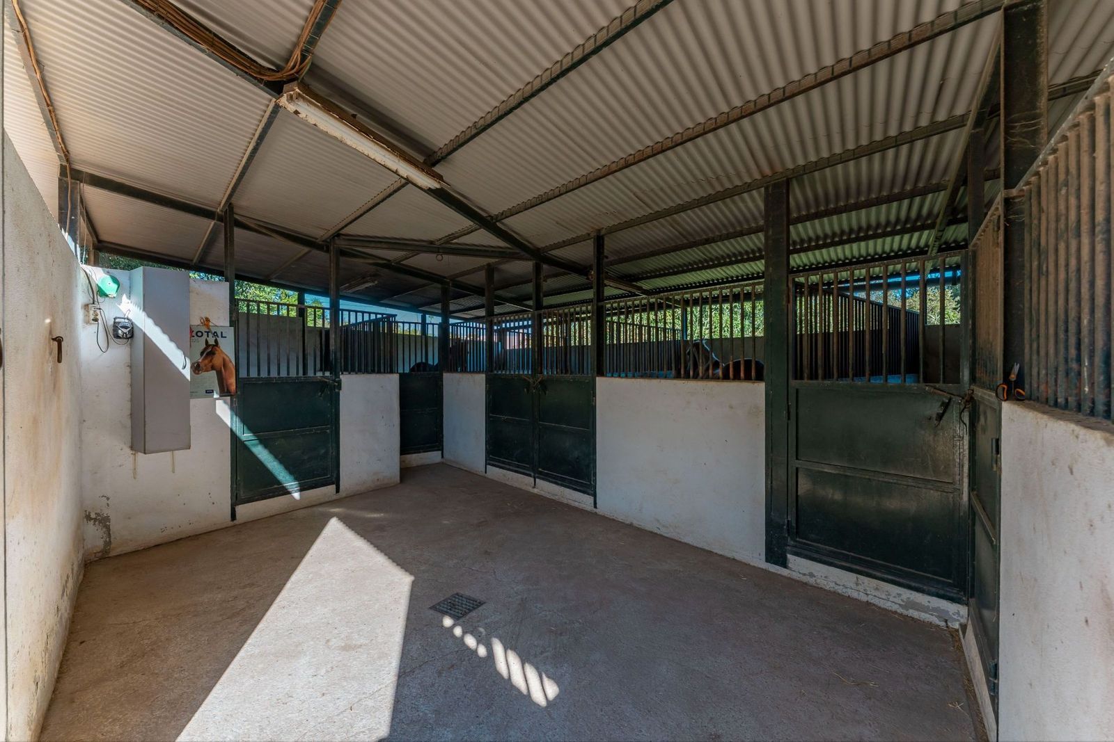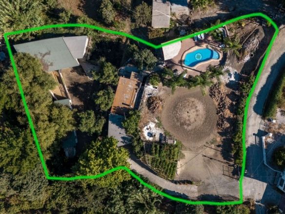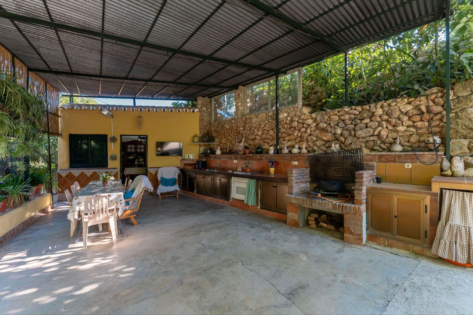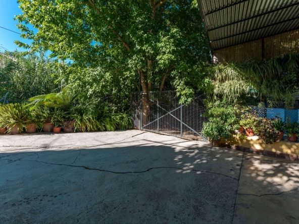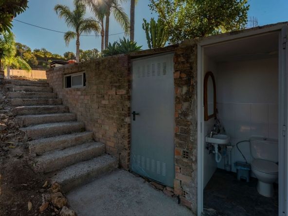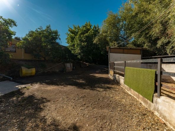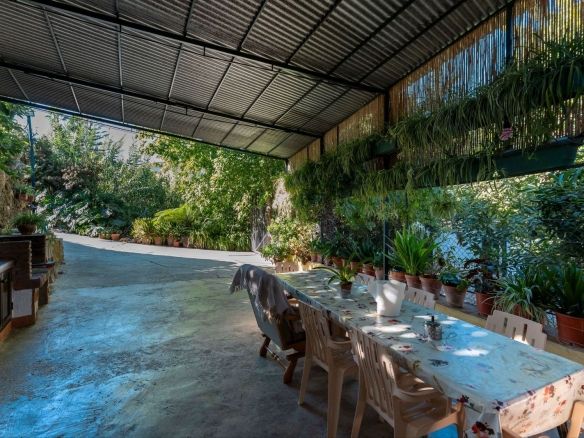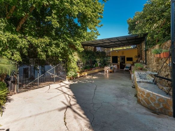 On the upper terrace, you will find a chlorine swimming pool, sun terrace, and a small kitchenette. There is also ample open parking for multiple vehicles. The middle terrace is home to the house, surrounded by mature trees that provide shade throughout the year. The lower terrace features six stables (with the possibility of creating four more), currently used as storage, a dog house, and a chicken run.