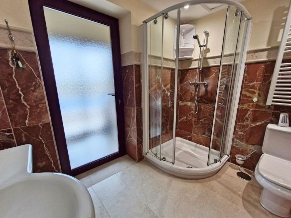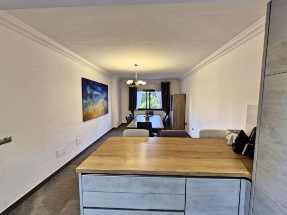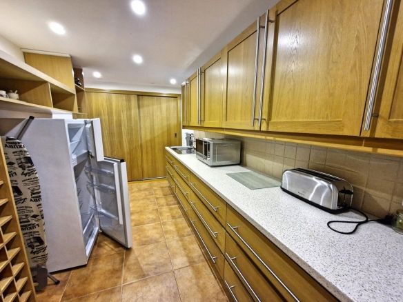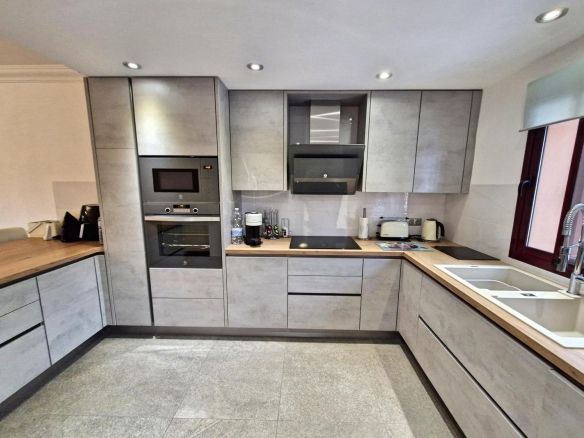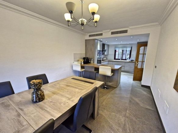 On a corner plot, this impressive & spacious property comprises: Ground floor entrance hallway to bright & spacious living room with access to pool terrace. A quality, modern fully equipped kitchen with breakfast bar and adjoining elegant dining room. Access from the kitchen hallway to a downstairs bathroom, utility room and stairs down to the guest apartment and garage. The basement accommodation contains a living room, kitchen, two large double bedrooms and a bathroom. Access to the apartment is from either the house or the garage, which has a gym area.