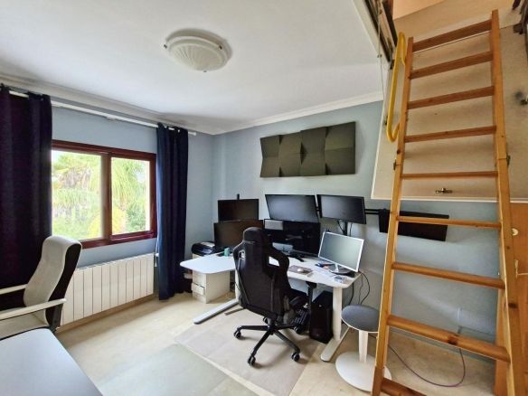 A wide staircase takes you upstairs to the first floor landing with access to the three double bedrooms with terraces and family bathroom. The master has a full en-suite bathroom and walk in wardrobes. There is also a unique attic room accessed from one of the bedrooms with a private terrace, ideal for a home office, music room or art studio.