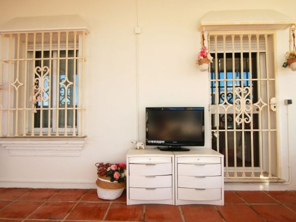 At the back of the property, there is a saltwater swimming pool surrounded by a sunbathing area, perfect for relaxing and enjoying the Costa del Sol climate.