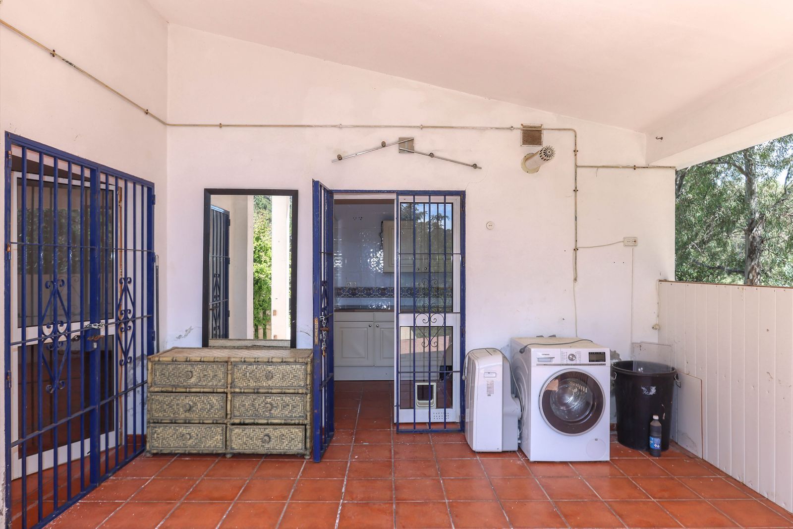 Accessed via the lower level, the main house includes a triple garage and a large storage room. Elevated above this area, the house is nestled among lush planting and enjoys complete privacy. A covered entrance porch welcomes you inside, where large windows flood the rooms with natural light. The spacious kitchen opens into conservatory, while the bright lounge leads into another conservatory overlooking the swimming pool.