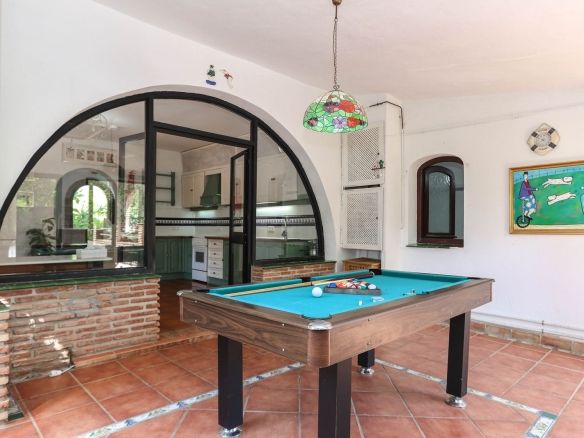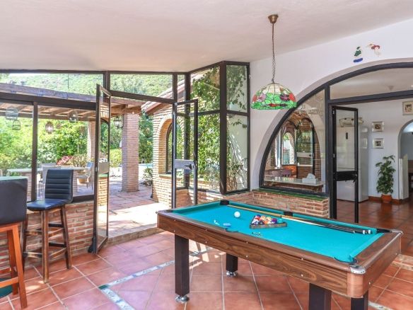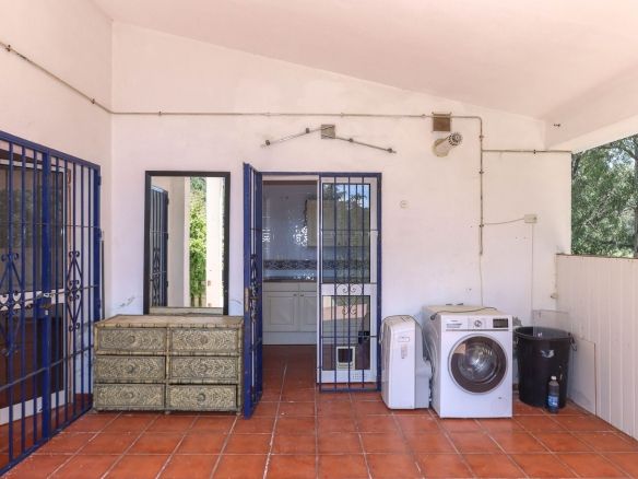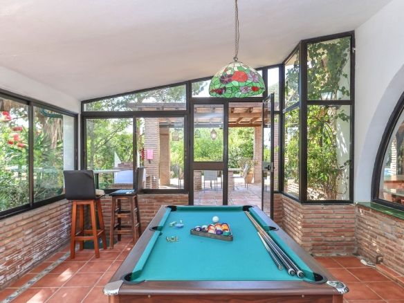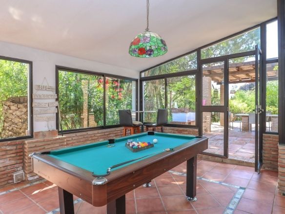 Accessed via the lower level, the main house includes a triple garage and a large storage room. Elevated above this area, the house is nestled among lush planting and enjoys complete privacy. A covered entrance porch welcomes you inside, where large windows flood the rooms with natural light. The spacious kitchen opens into conservatory, while the bright lounge leads into another conservatory overlooking the swimming pool.
