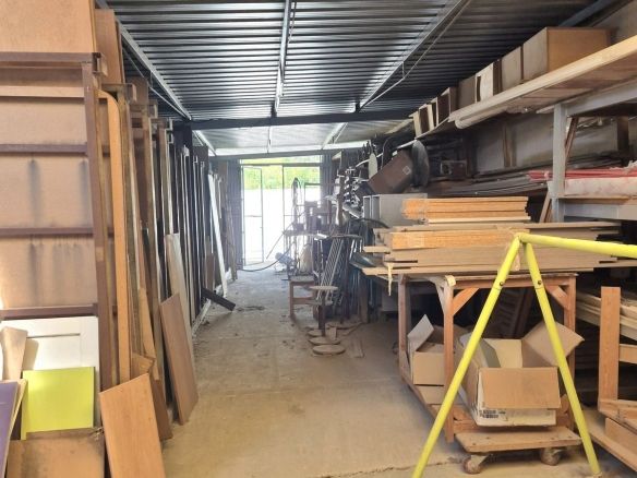 Upon entering, you will find a parking area with a carport and open spaces for more vehicles. From here, you access a large 449 m² warehouse/workshop, a versatile space with enormous potential to develop your own business, use it as a stable, or for other purposes. The workshop includes: