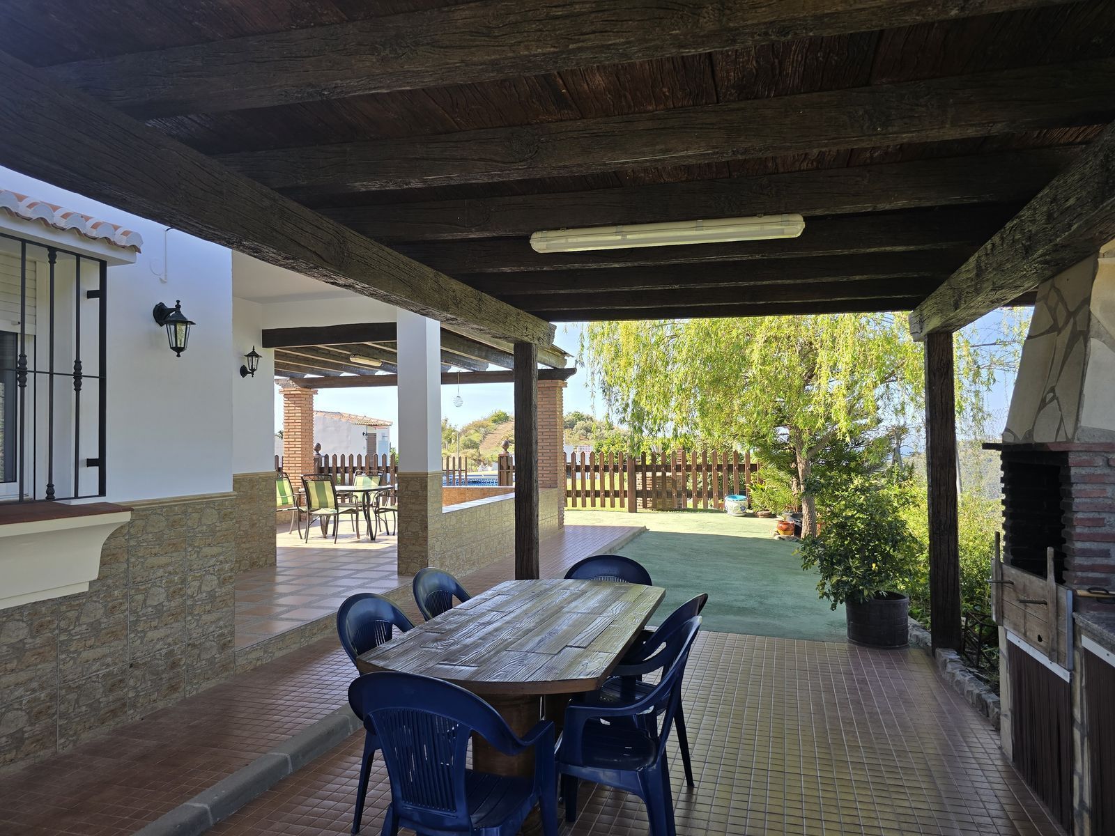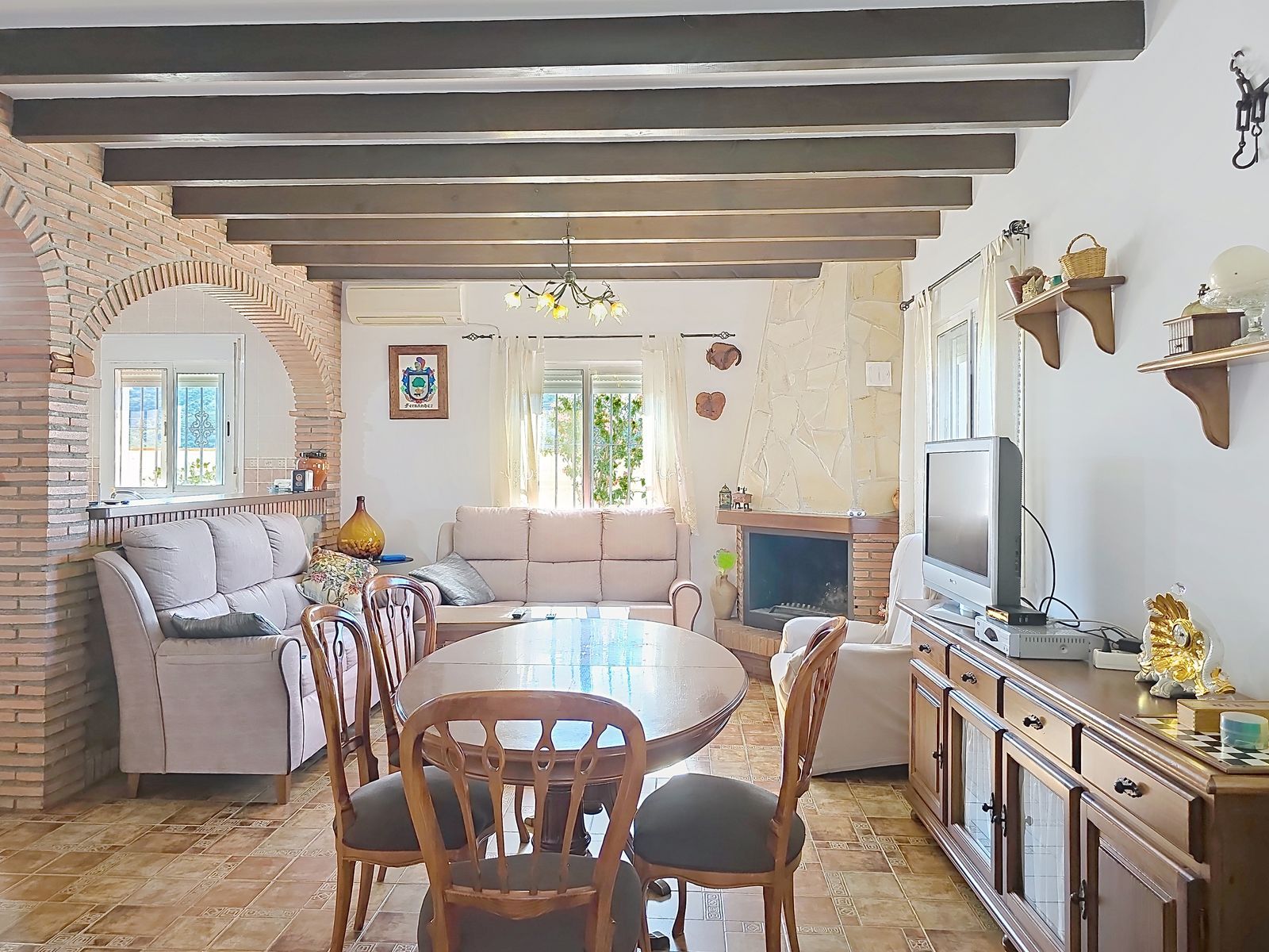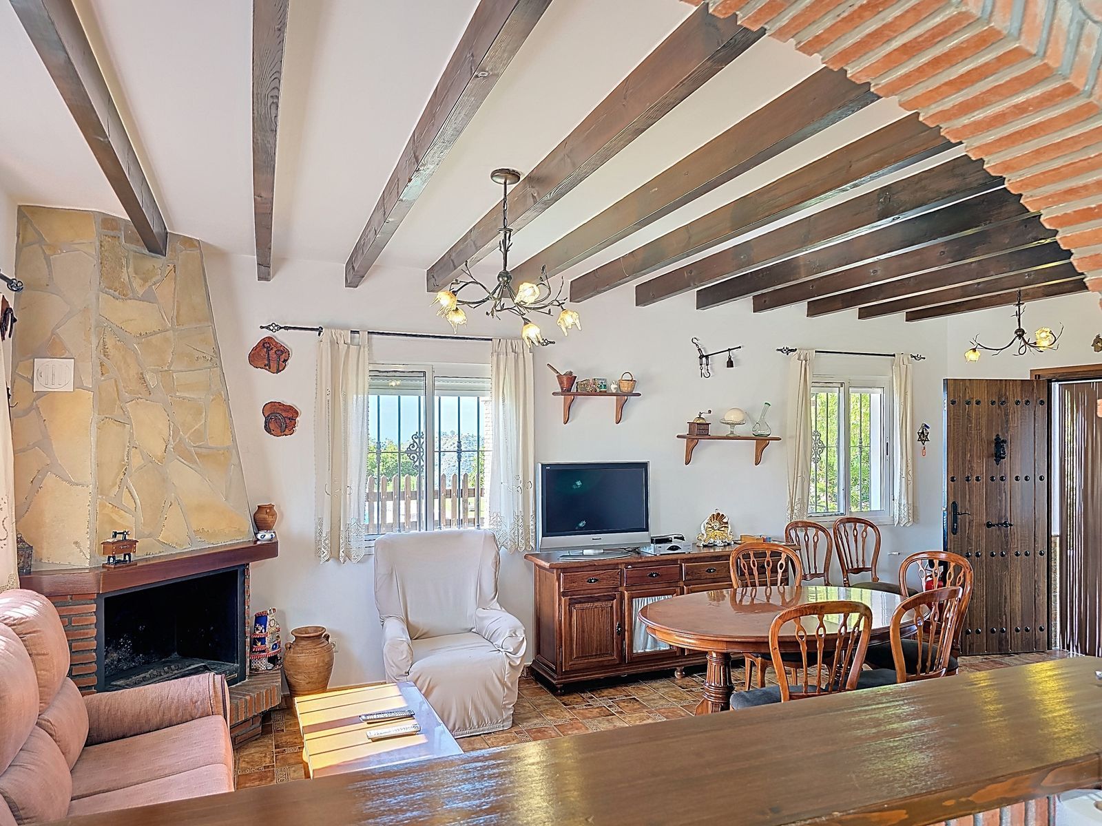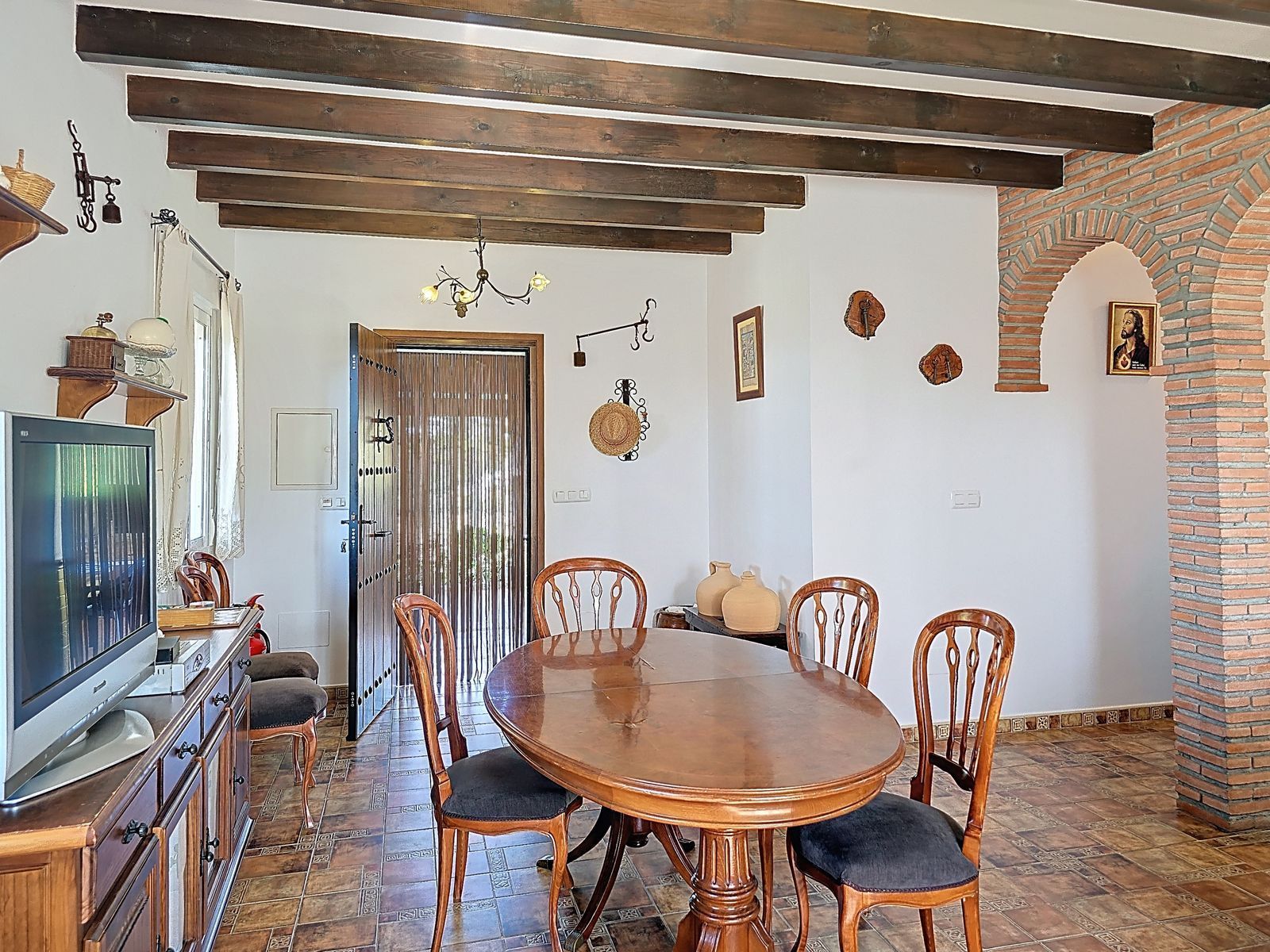 Stepping inside, you’ll immediately be captivated by the villa’s authentic Andalusian charm, with high beamed ceilings, exposed brickwork, and rustic details that create a warm and inviting atmosphere. The thoughtfully designed layout features: