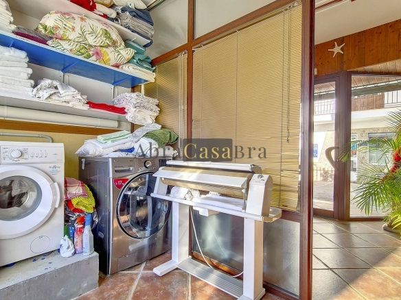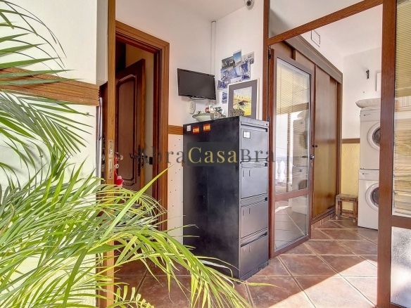 The first thing you notice when you enter is the large hall with the beautiful staircase to the first floor and the open passage to the living/dining area. To the left of the hall is a room currently used as storage, but could easily be transformed into an extra bedroom. The living/dining room with open kitchen is bright and spacious. The modern and spacious kitchen is fully equipped. At the end of the hall is a bathroom with toilet and a room currently used as an office. This area has its own entrance through a glass front. Behind this office is a separate room, currently used as a laundry room, and a balcony.