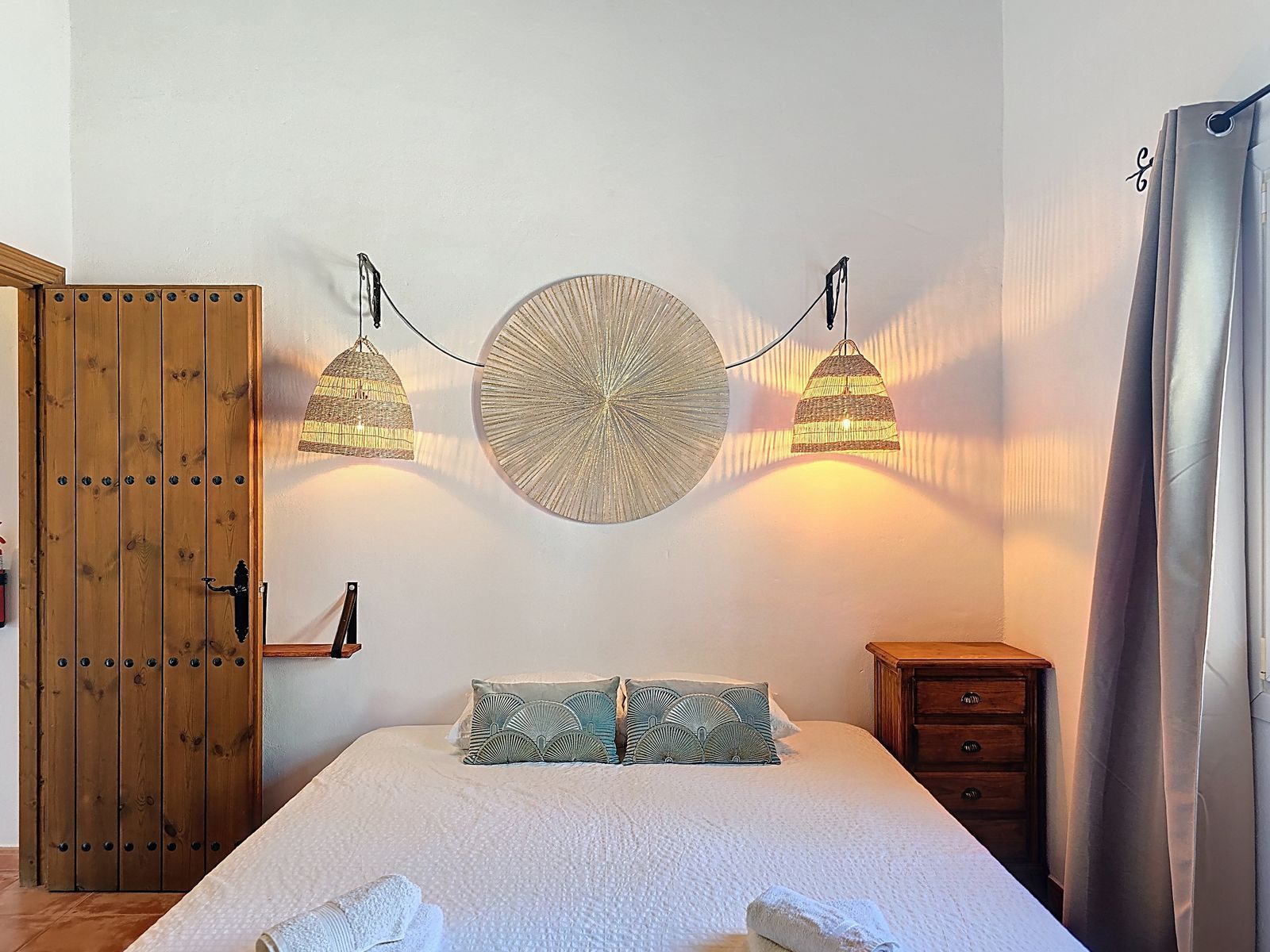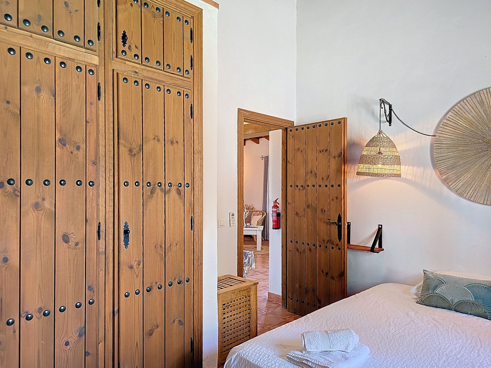 The property offers three well-proportioned double bedrooms, each with built-in storage and views of the surrounding countryside. One of the bedrooms benefits from an en-suite bathroom, providing added privacy and convenience. A second, family-sized bathroom is finished with traditional Andalusian tiles and stylish fixtures, offering a bright and functional space for residents and guests alike.