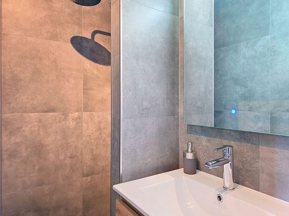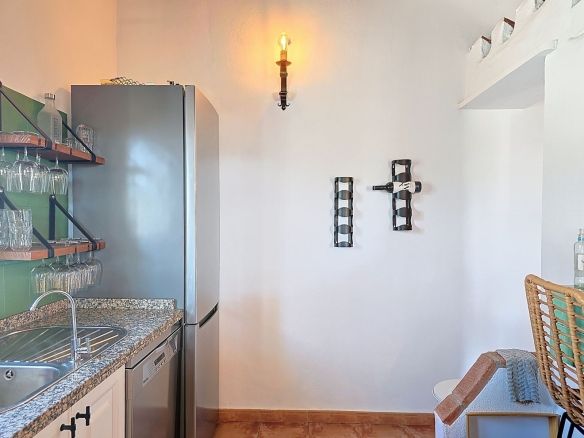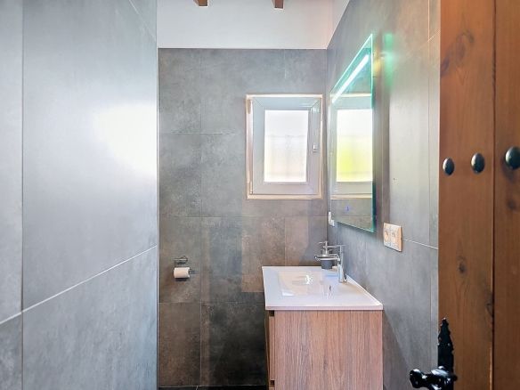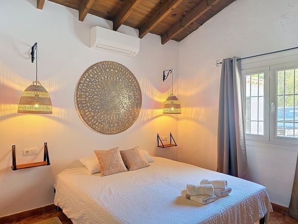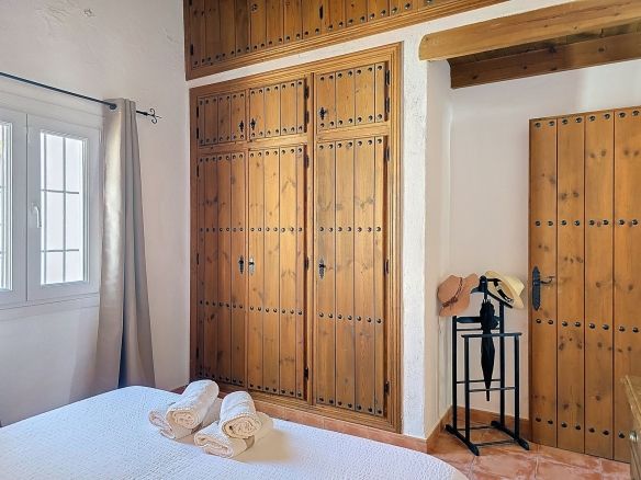 The property offers three well-proportioned double bedrooms, each with built-in storage and views of the surrounding countryside. One of the bedrooms benefits from an en-suite bathroom, providing added privacy and convenience. A second, family-sized bathroom is finished with traditional Andalusian tiles and stylish fixtures, offering a bright and functional space for residents and guests alike.