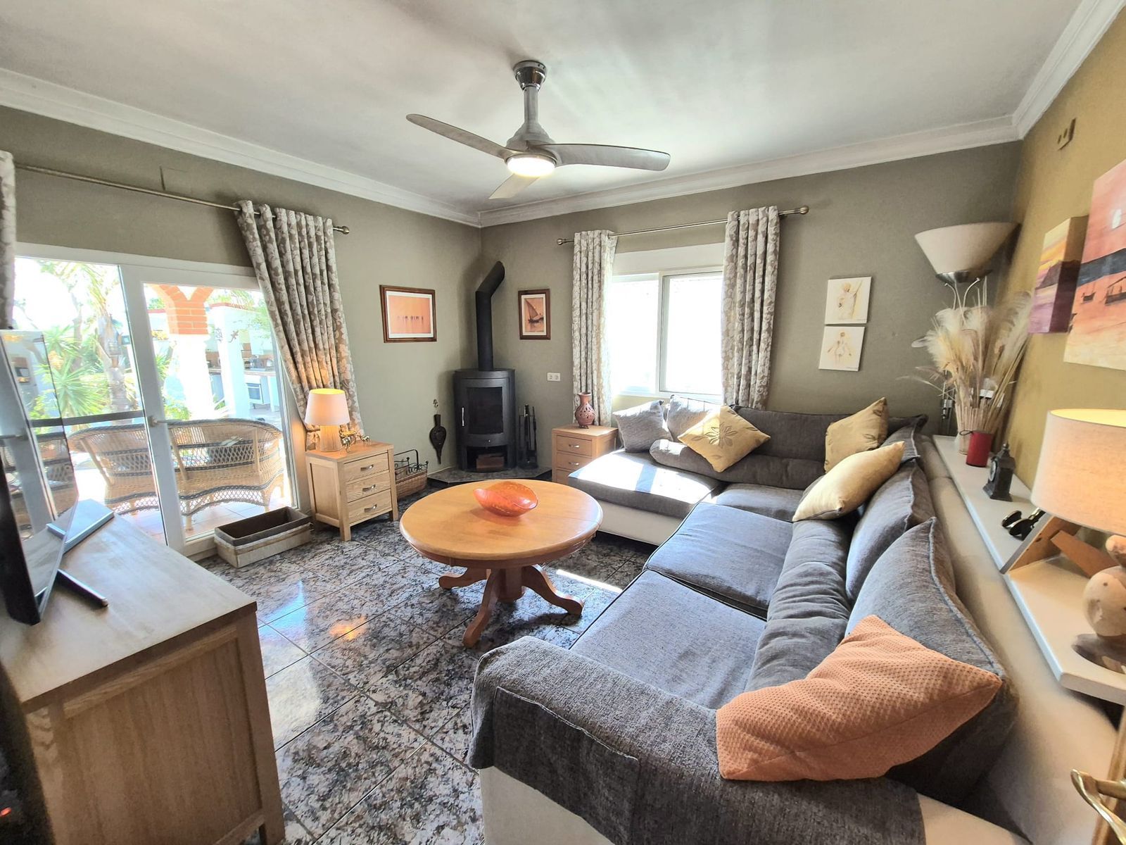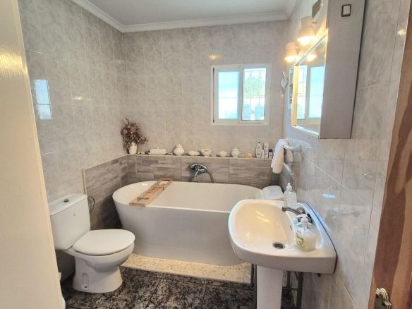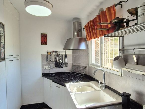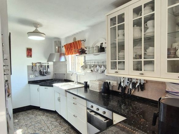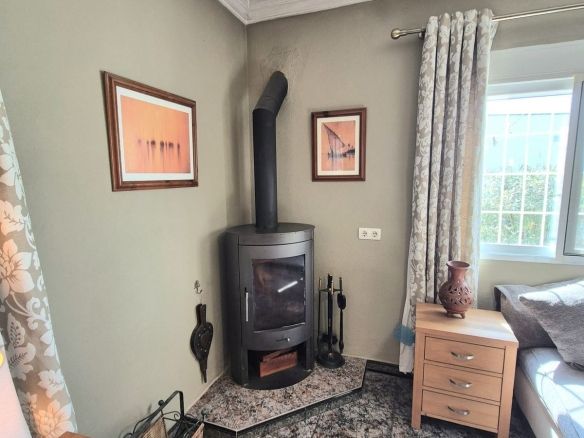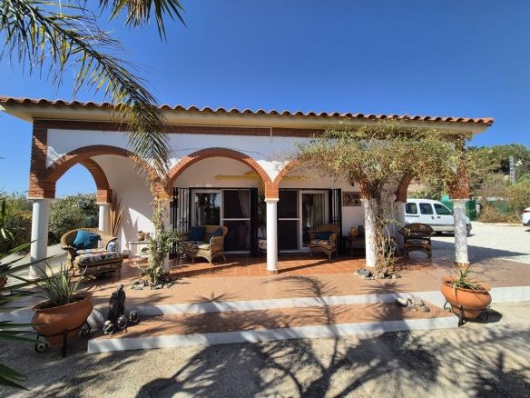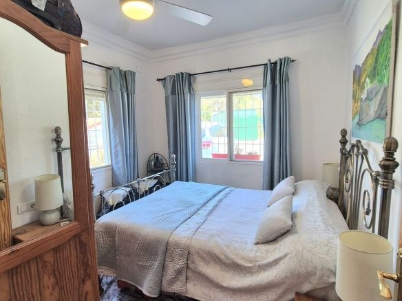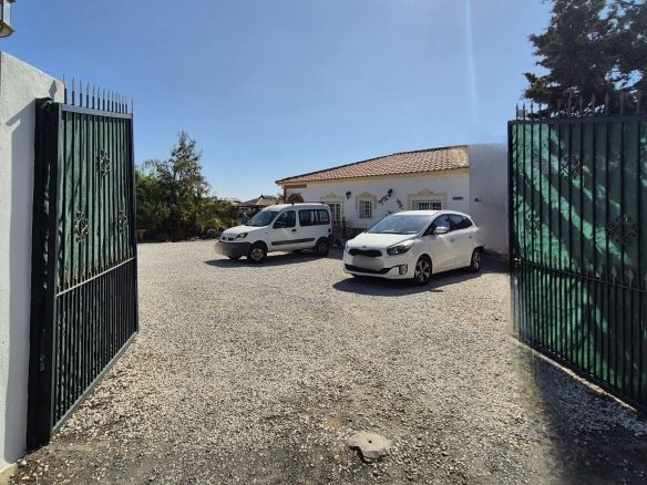The property is located down a great tarmac road, you enter via large double gates into a large stoned area at the side of the house with plenty of parking. From here you enter the house, on the right you have a lounge with fireplace and you can access the back courtyard where you will find the laundry / pantry room. Back into the living room you have the fully fitted kitchen and a bathroom with a shower. Back into the front hallway you have to the left a double bedroom, a bathroom with a nice soaker tub, the master bedroom is straight ahead with access to the back covered terrace and pool area and to the right the 3rd bedroom also with access to the same covered terrace, the current owners are using this room as a second sitting room. There is stairs around the front that leads you up to the solarium where you have fantastic panoramic mountain views.