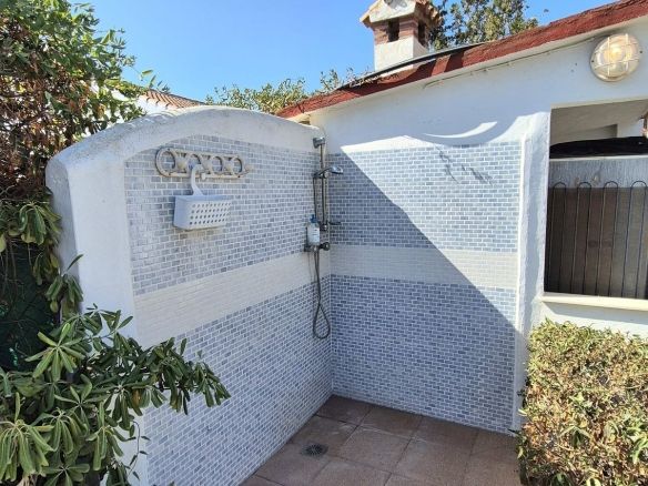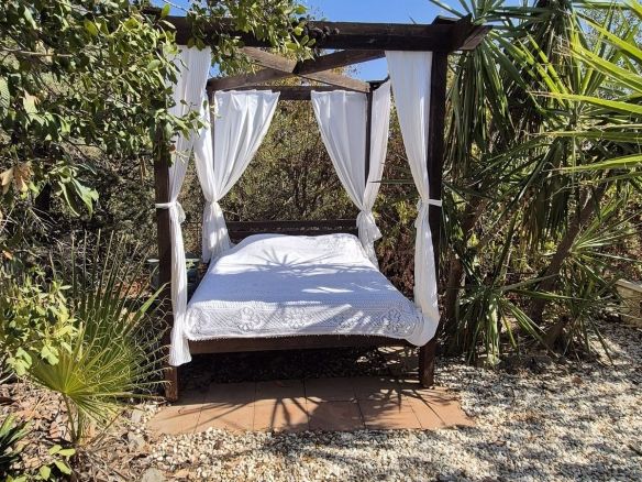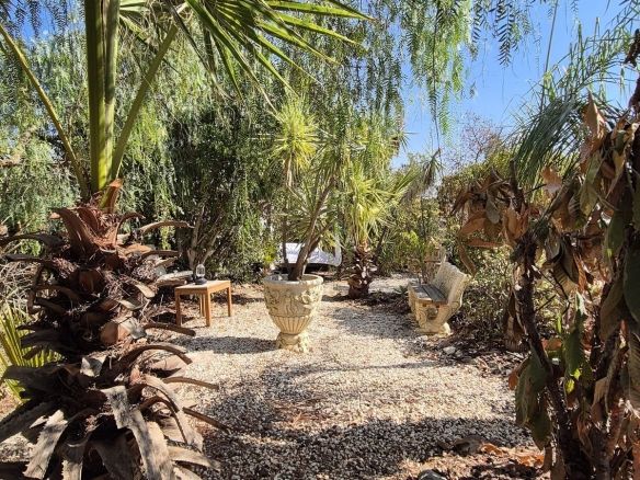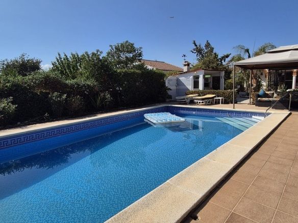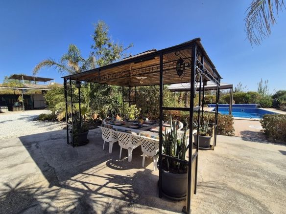 There is a fabulous large pool area, the pool is 10x5m and has a cover, outside shower, full outside kitchen, several seating areas to enjoy eating al fresco, sunbathing.. Lots of mature trees and plants on the plot, there is around 2000m2 of land behind here separately fenced off where you have your private water well. Next to the pool area you have more seating areas, a workshop with electric and air con and a car port for 3 cars.