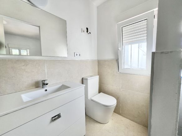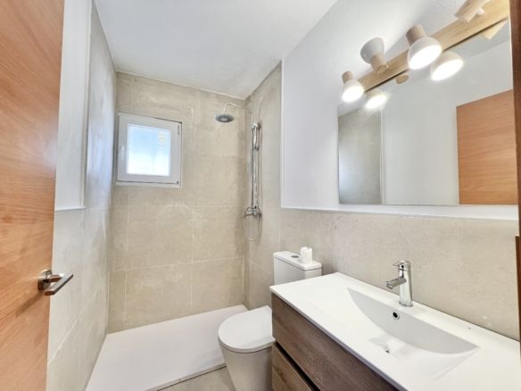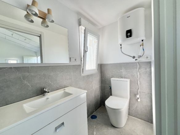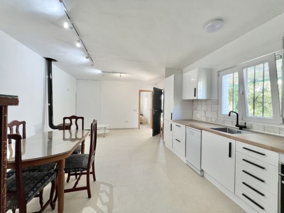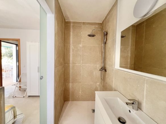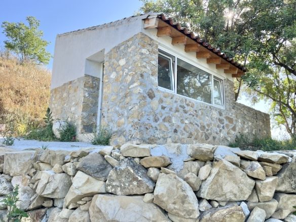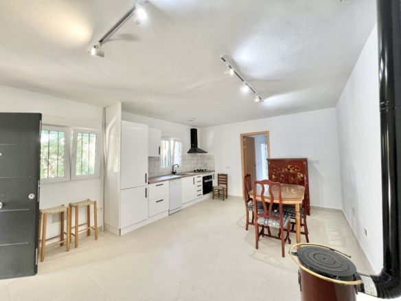The main house, at 91 sq metres, offers two completely renovated double bedrooms, both with ensuite and each with views down over the finca. One of the bedrooms has direct access to the front terrace. Both are well proportioned and in move in condition. The bedrooms are joined by the central living space, which is an open plan are with fitted kitchen, traditional wood burner and ample space to create both a dining and living area also. The living space also has a concealed cupboard area which hosts the washing machine and offers storage. The front terrace runs the length of the property and is partially covered to offer extended living accommodation throughout the year.