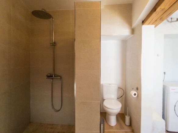 The spacious yet cozy living room is the warm heart of the house, featuring a fireplace and a fully equipped open kitchen with bar. The bright, modern bathroom offers every luxury with a stylish double sink vanity, a spacious walk-in shower, a semi-separate toilet, and a washing machine.