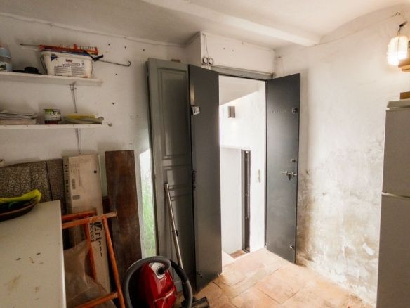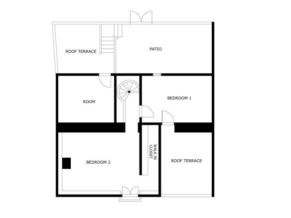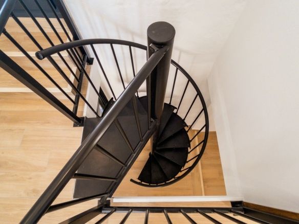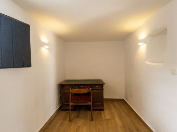 An open passage leads to the dining area under an impressive five-meter-high ceiling. From here there is access to the patio and a separate office, which can also serve as an additional bedroom. A striking spiral staircase takes you upstairs, where two spacious bedrooms await. The master bedroom includes a walk-in closet and a French balcony, while the second bedroom is light, airy, and has direct access to a large terrace with beautiful views.