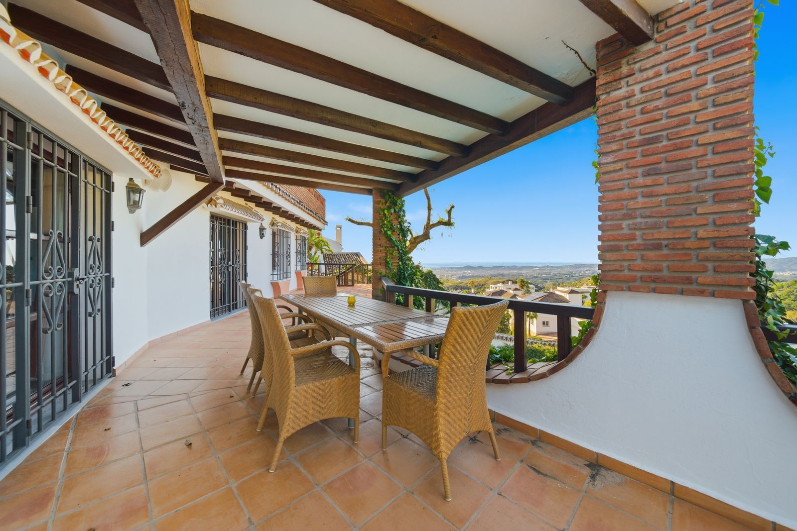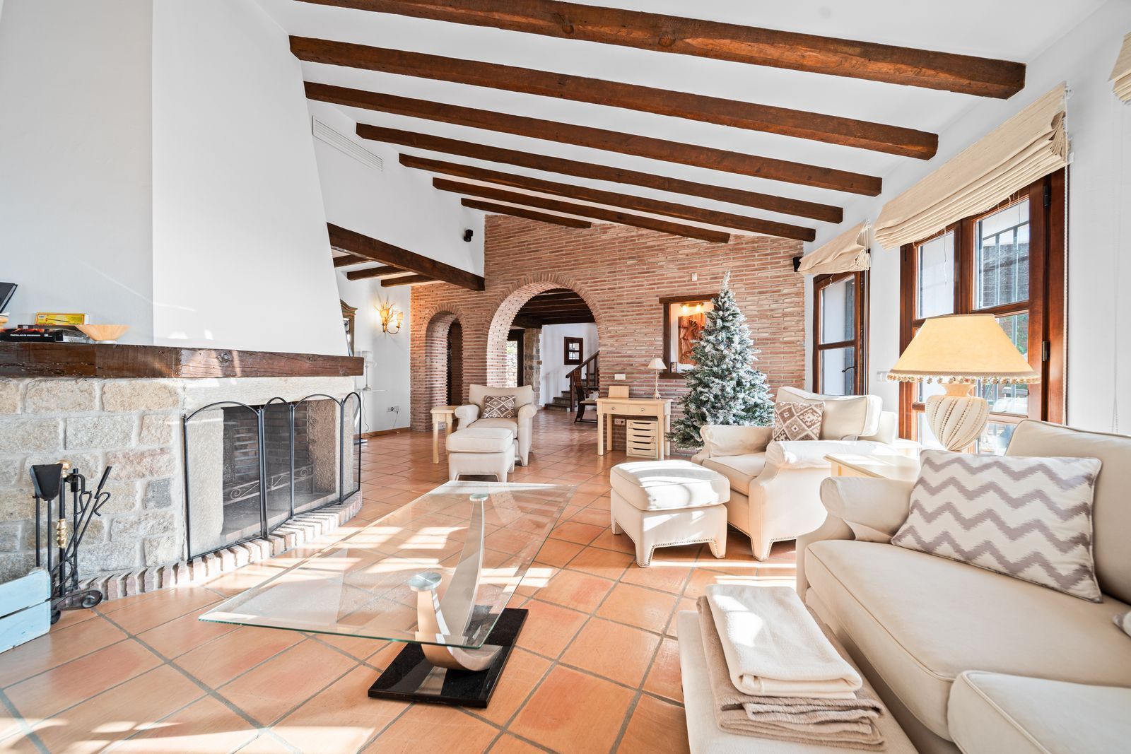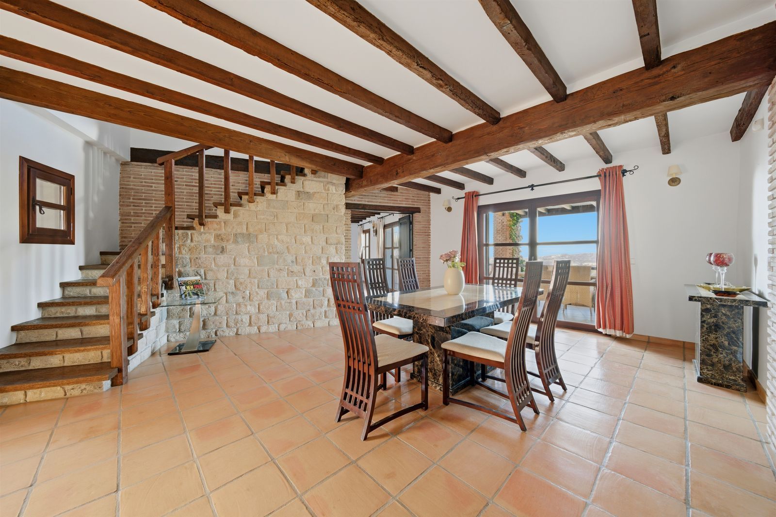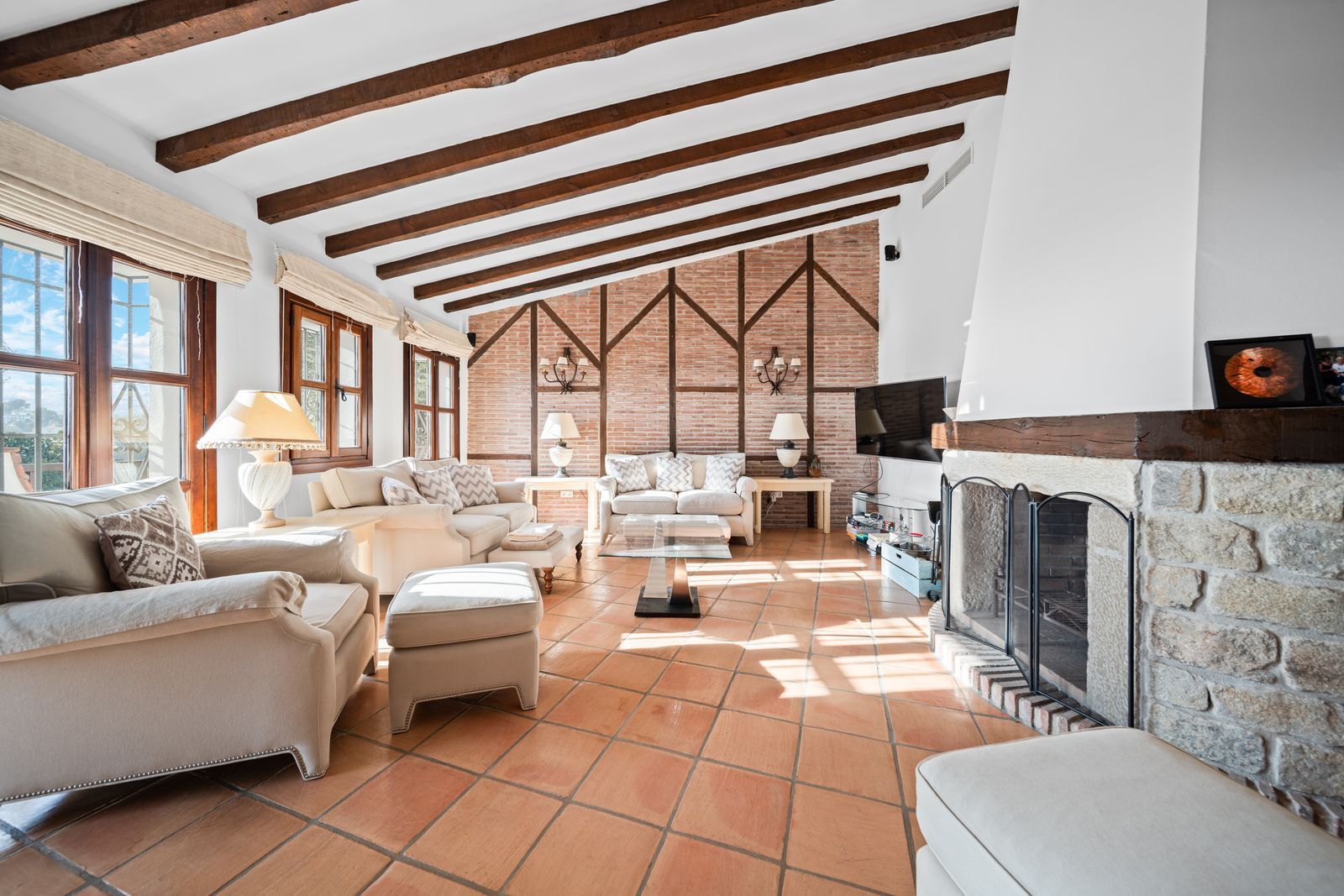 The villa is in excellent condition and captivates with its authentic Andalusian character: beautiful wooden beams, brick and stone details, and an elegant rustic finish that creates a warm and inviting atmosphere.