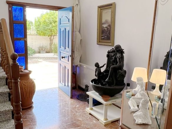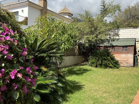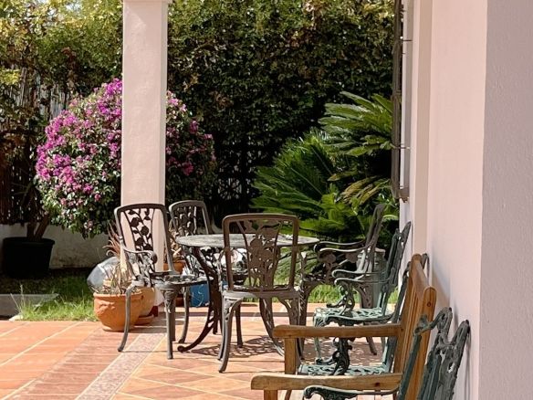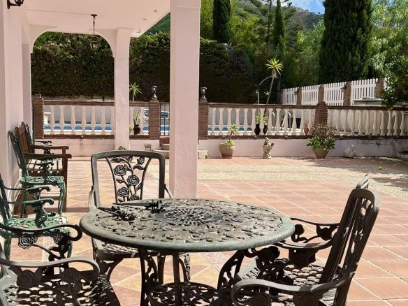 CHARMING ANDALUSIAN VILLA situated on a quiet gated cul-de-sac just outside Mijas Pueblo. Boasts privacy in a peaceful location, only a 5-minute drive from town center. South orientation in a very private setting. Large private swimming pool with terrace surround, BBQ area, mature gardens with fruit trees, a storage cupboard and a gardener’s shed. There is a garage with extra parking space on spacious driveway. Lovely front covered porch with pillars. Beautiful mountain views and partial sea views from top floor.