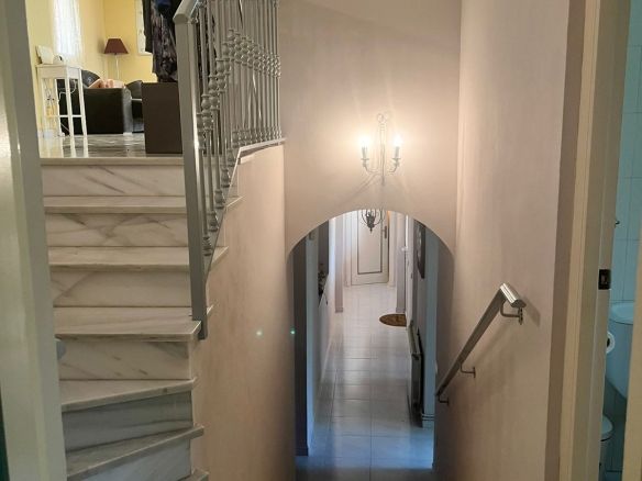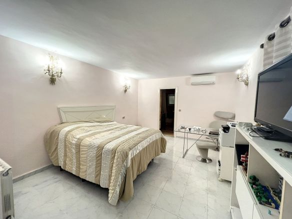Moving downstairs, you'll discover the vast master bedroom, featuring an oversized en suite bathroom and a walk-in closet for your convenience. Two more well-appointed bedrooms, each with fitted wardrobes, and another full bathroom await. The property is equipped with air conditioning for both heating and cooling.