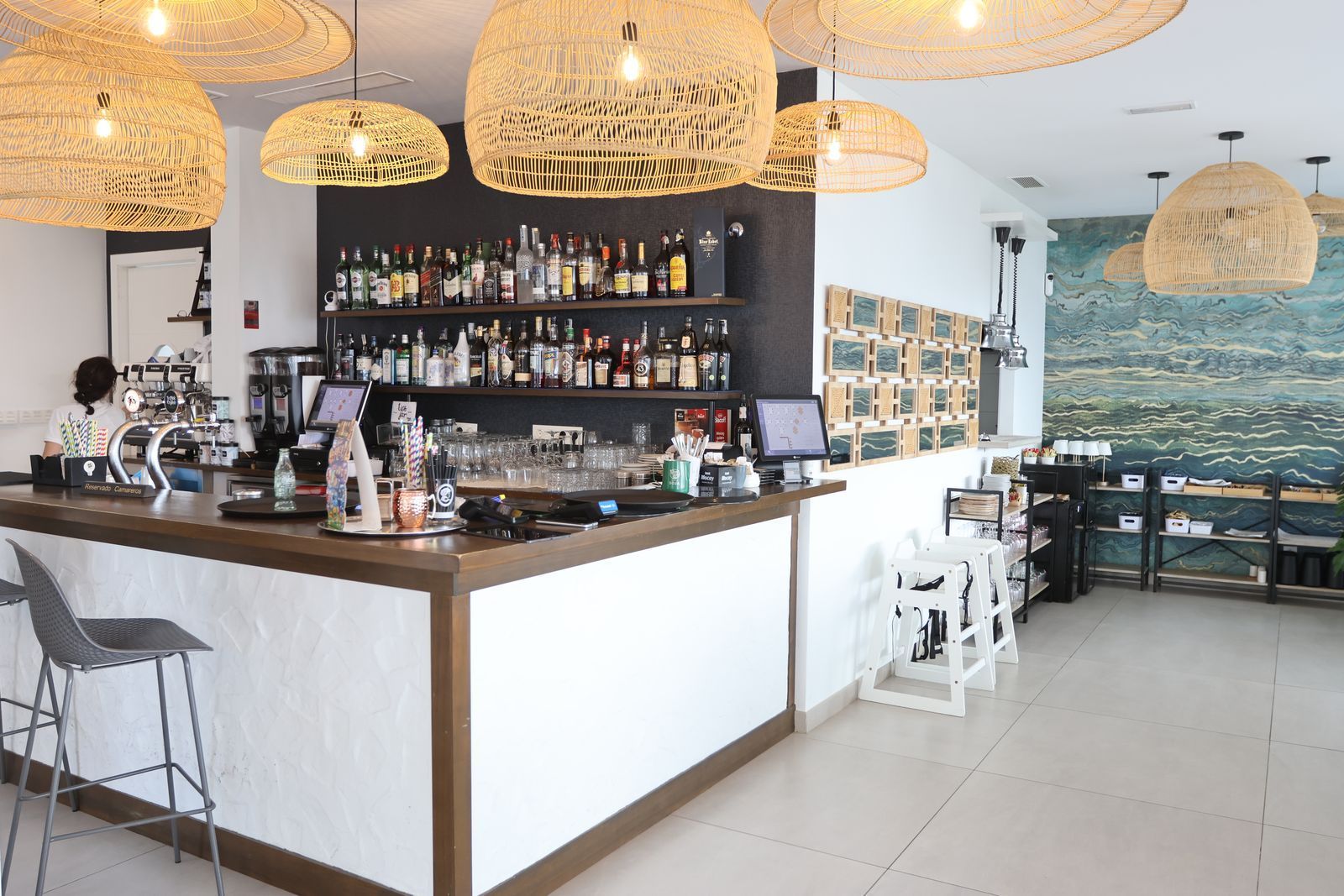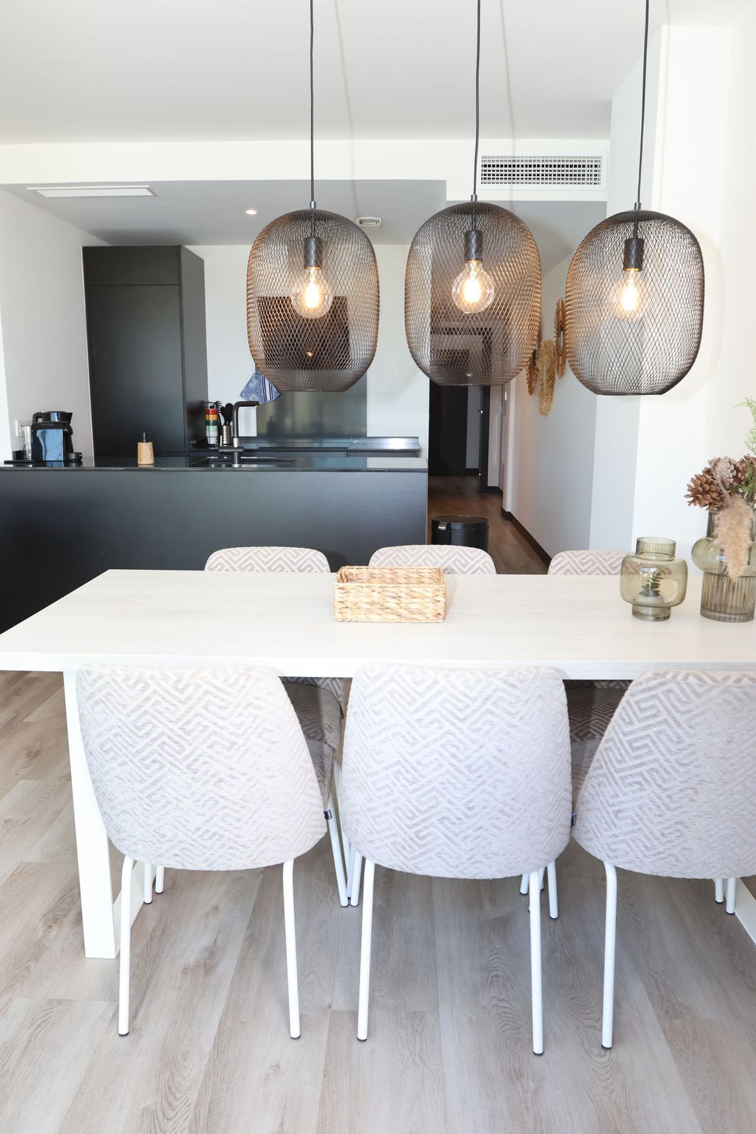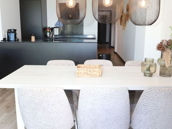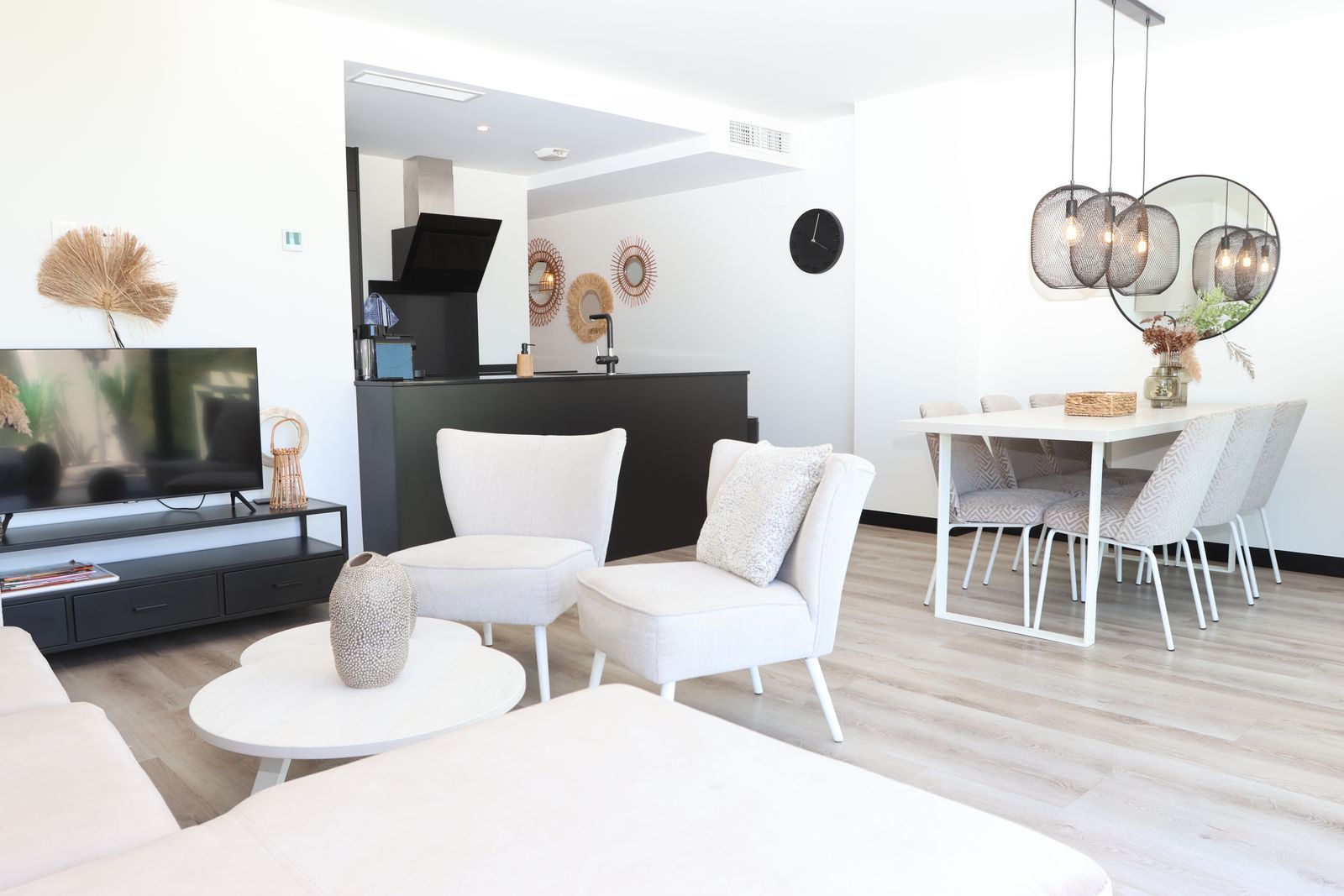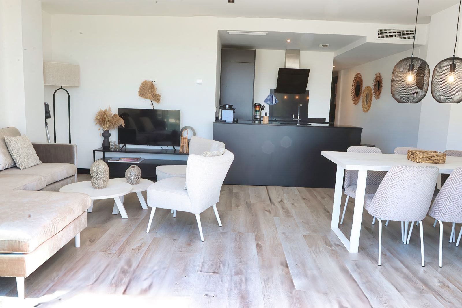 Open-plan living and dining area with floor-to-ceiling windows for natural light which open out to the semi covered terrace to enjoy the panoramic sea views.