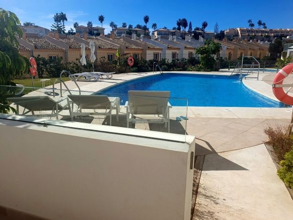 A large private terrace with direct access to the communal pool with showers, perfect for enjoying the Mediterranean climate.